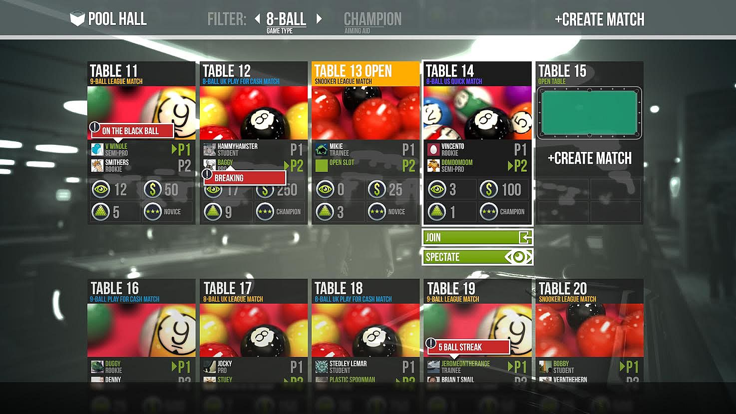 - Ten different game types including, Snooker, 8 Ball UK, Speed, Rotation, Golf, Straight, 8 Ball US, 9Ball, 3 Ball & Killer
