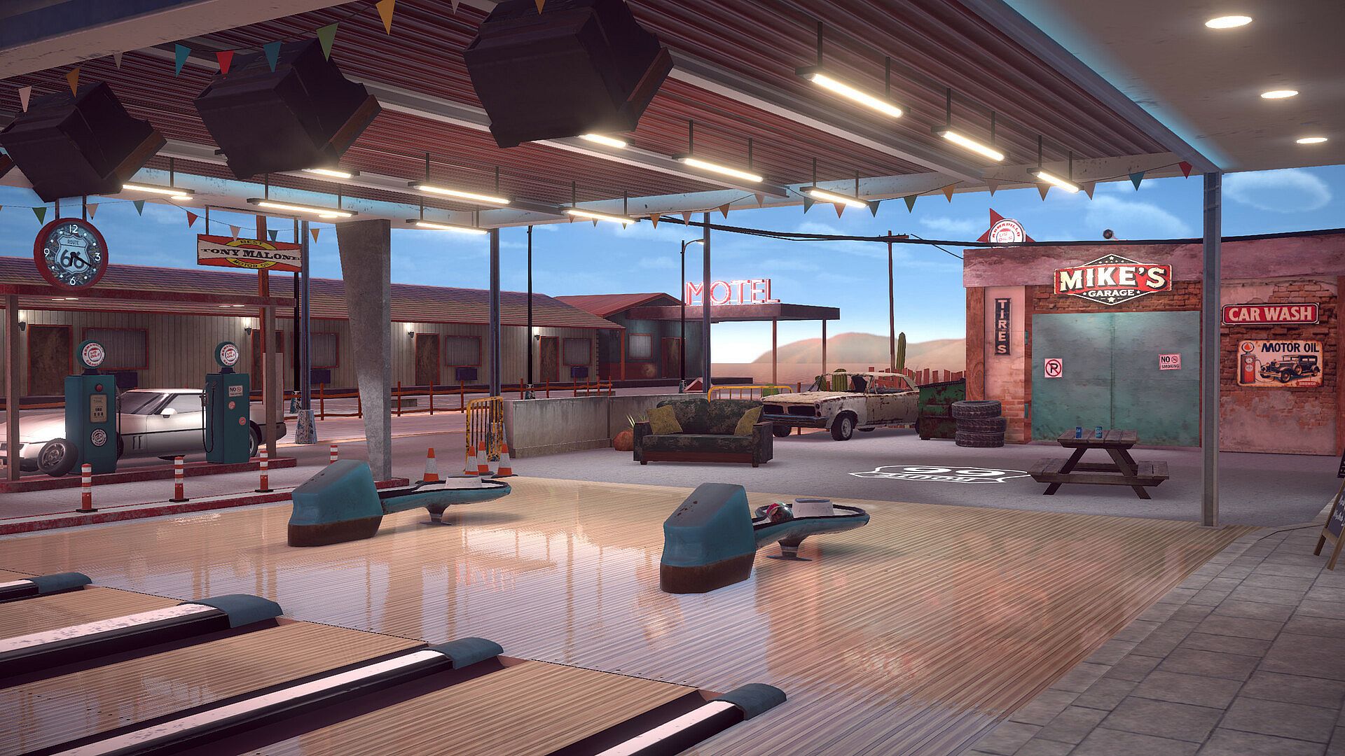 Set in the heart of a desolate desert along Route 66, this open-air bowling alley right next to a weathered gas station offers an unparalleled experience. Surrounded by golden sands, rusting cars, and the scorching sun, it adds a truly unique twist to Premium Bowling, blending the serene yet vibrant beauty of the desert with the timeless thrill of the lanes.