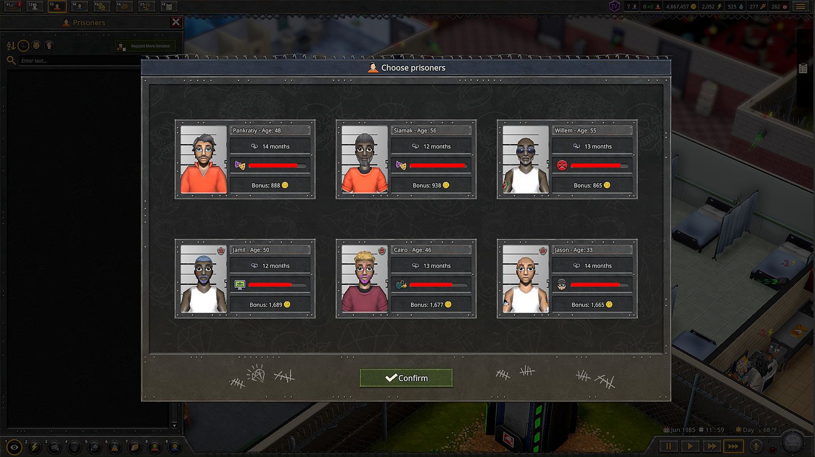 - Select from a list of inmates daily, so you can build a roster of prisoners that best suits your management style.
