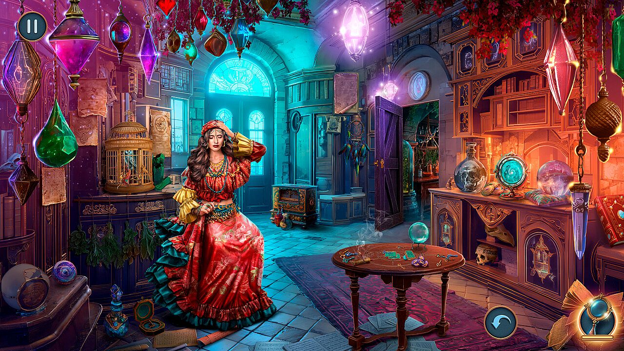 Enter the shadowy tent of the mysterious fortune teller, where the air is thick with intrigue. As you sit before her, she reveals clues about the fate of Glissando. The faint light from behind her cloth curtain adds to the suspense. Will her words guide you or trick you?