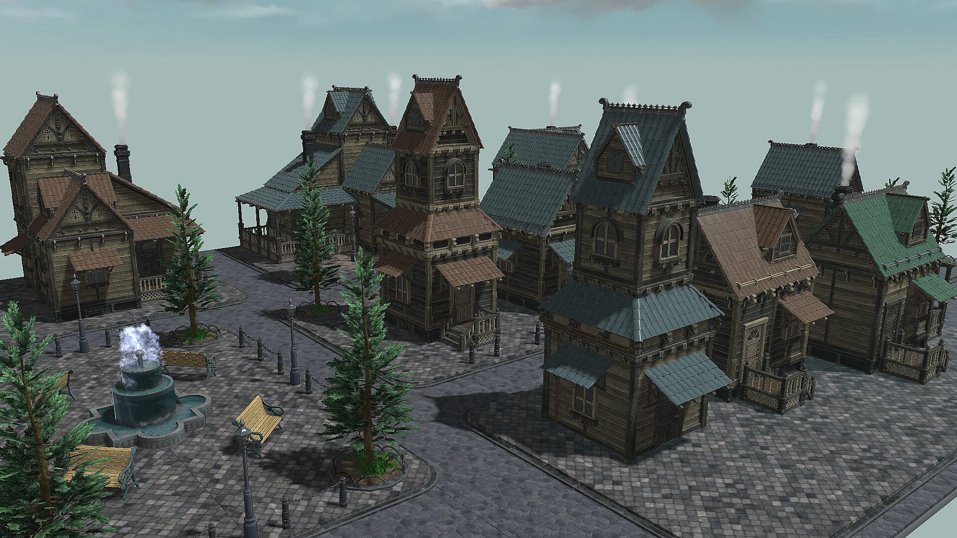This DLC lets you recreate a classic Victorian-style world, featuring grand mansions, towns with smoke rising from chimneys, and plazas adorned with cobblestone paths and fountains. It includes modular parts such as building walls and windows, decorative objects like benches, fences, fountains, and streetlights, as well as ready-to-use prefab buildings and sample town maps.