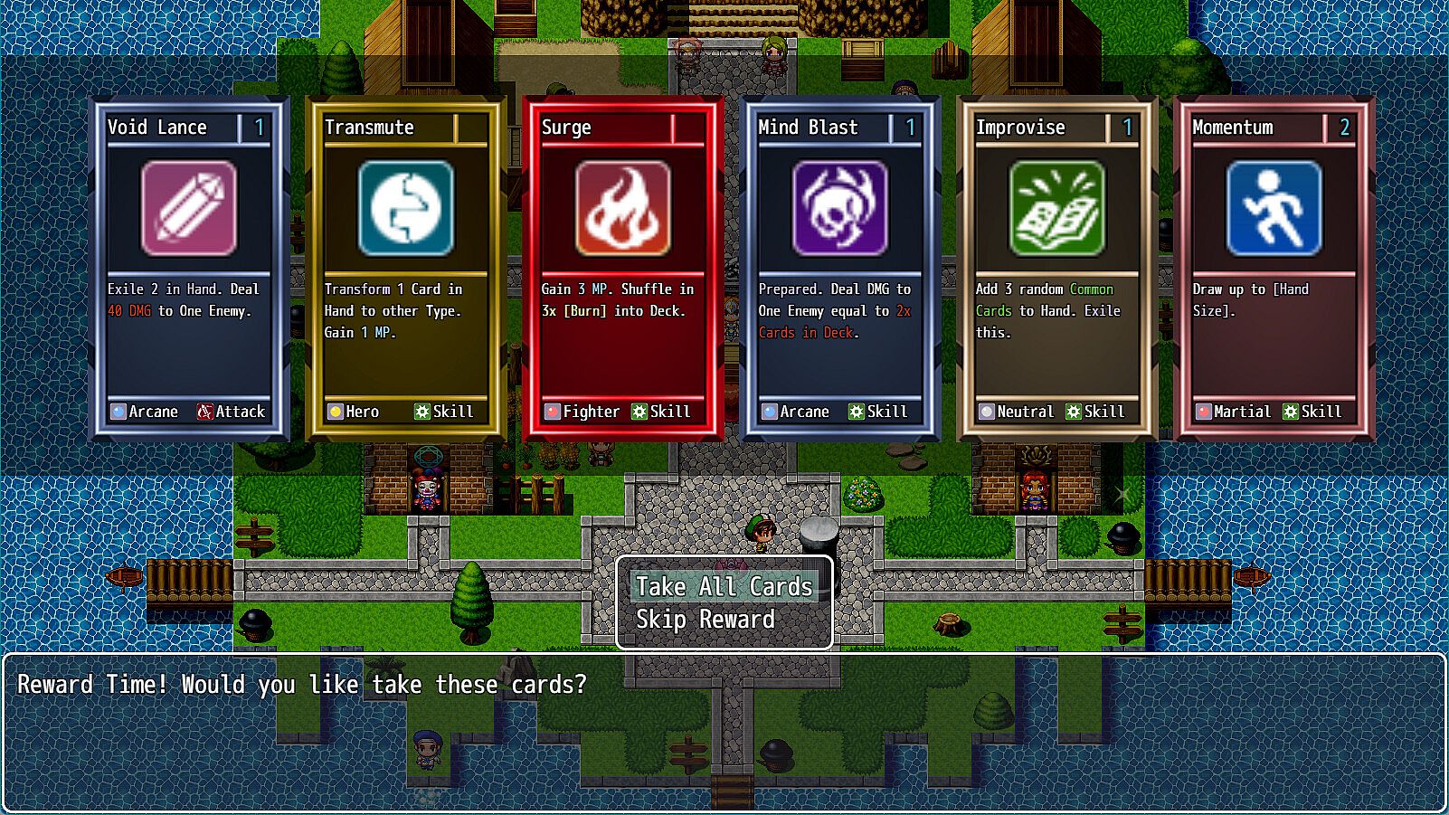 Card Game Combat is a suite of plugins that enables Roguelike Deck Builder gameplay. CGC converts an Actor's Skill List into a deck of Cards. Cards in an Actor's Deck can be added, removed and transformed using a variety of methods. When you enter a Battle, these Cards are drawn to your Hand and can be played using the Actor's resources. Multiple cards can be played this way until the player or a card effect ends the Actor’s turn.