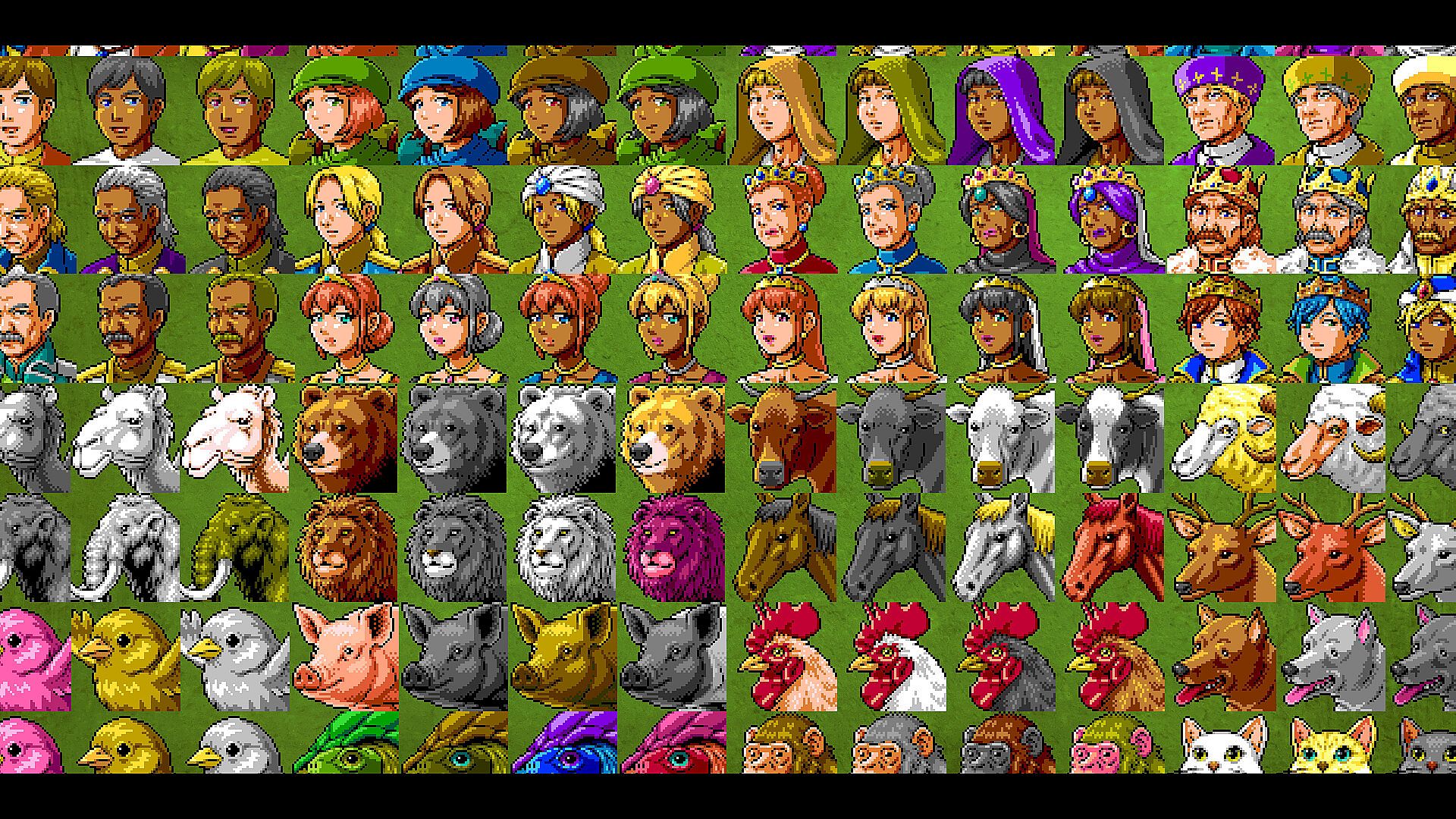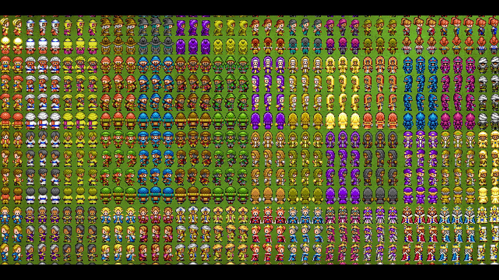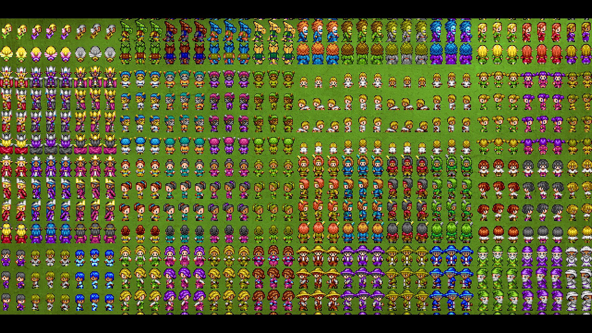This asset pack was created under the limitations of the classic “9-bit color” (512 colors) used in old 16-bit home consoles, with color palettes restricted to 15 colors per palette.