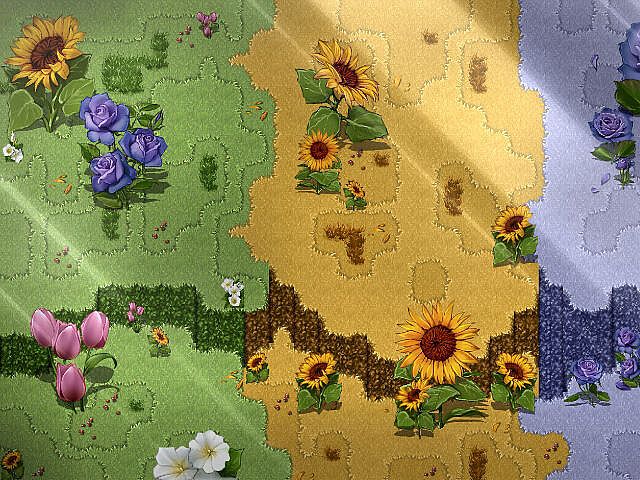 A multi-colored wilderness with giant blossoms for trees, with more in store! Grab your allergy medicine and venture forth with the Flower Forest tileset for RPG Maker! Suitable for wilderness and also gardens!