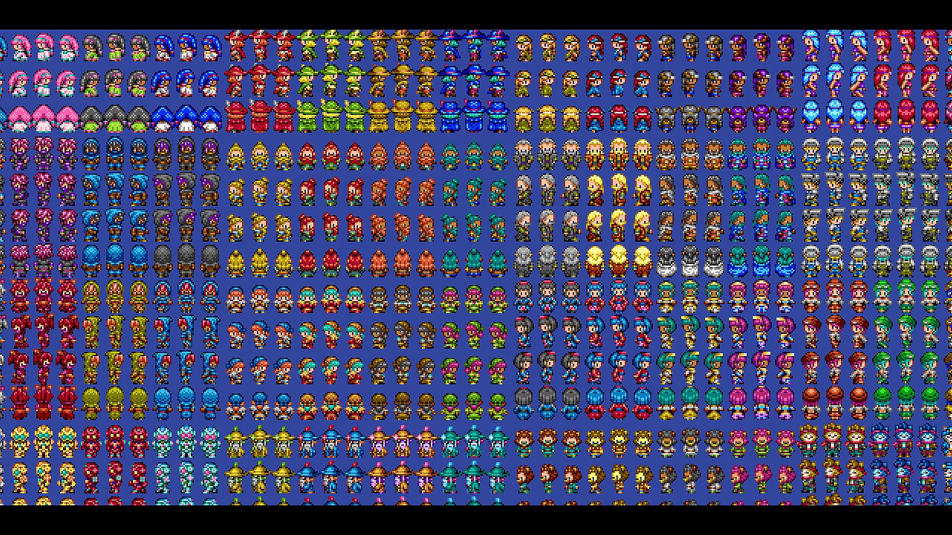 This asset collection was created under the unique constraint of using only the "9-bit color" 512-color palette, reminiscent of classic 16-bit home gaming systems. All color arrangements are limited to palettes of 15 colors each, ensuring a retro aesthetic.