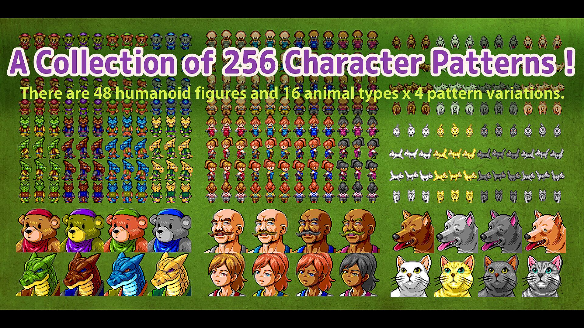 The set includes 48 humanoid characters and 16 animals, each with 4 variations.
