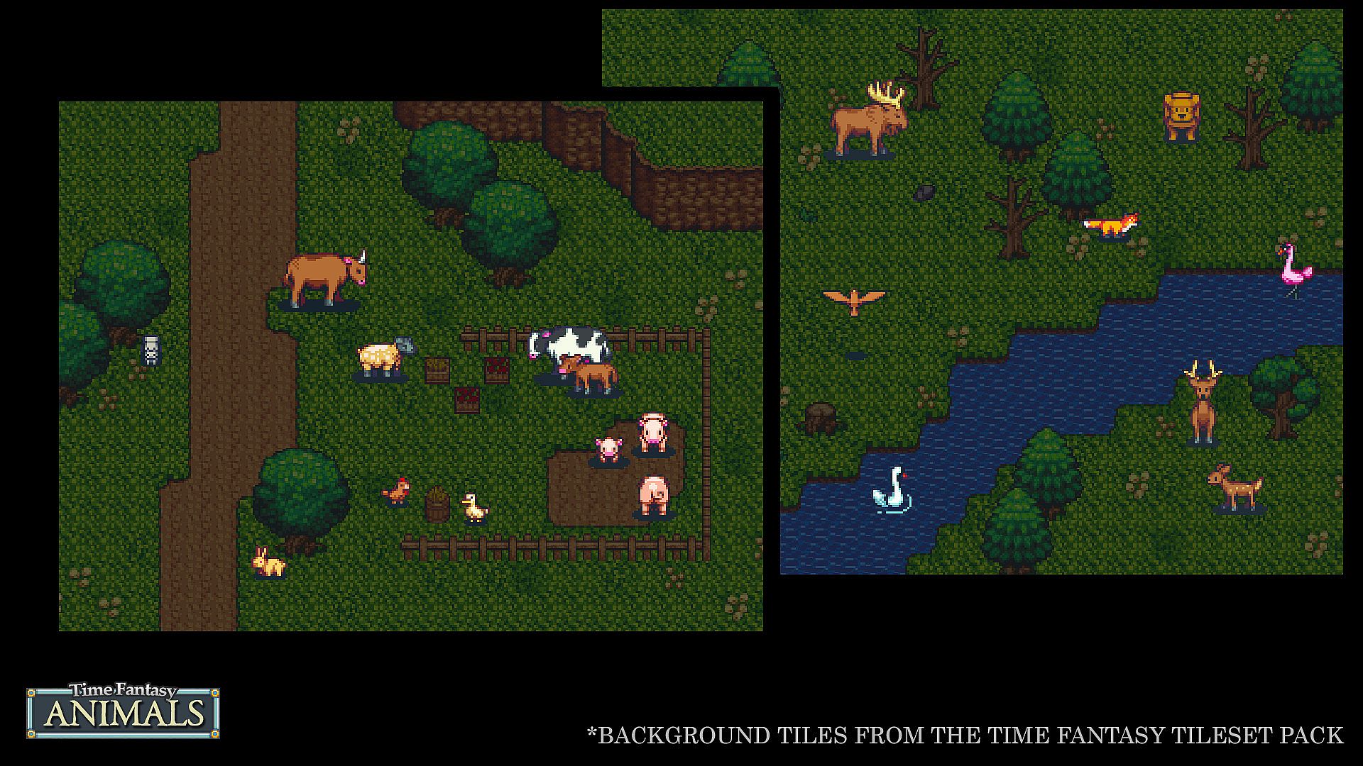 This expansion pack includes 48 animal sprites. Every animal you need for a farm: cows, pigs, chickens, goats and sheep, with babies and adults. Forest animals such as deer and bears, with squirrels, rabbits and other small creatures to populate your world. Birds of different kinds can take to the sky!
