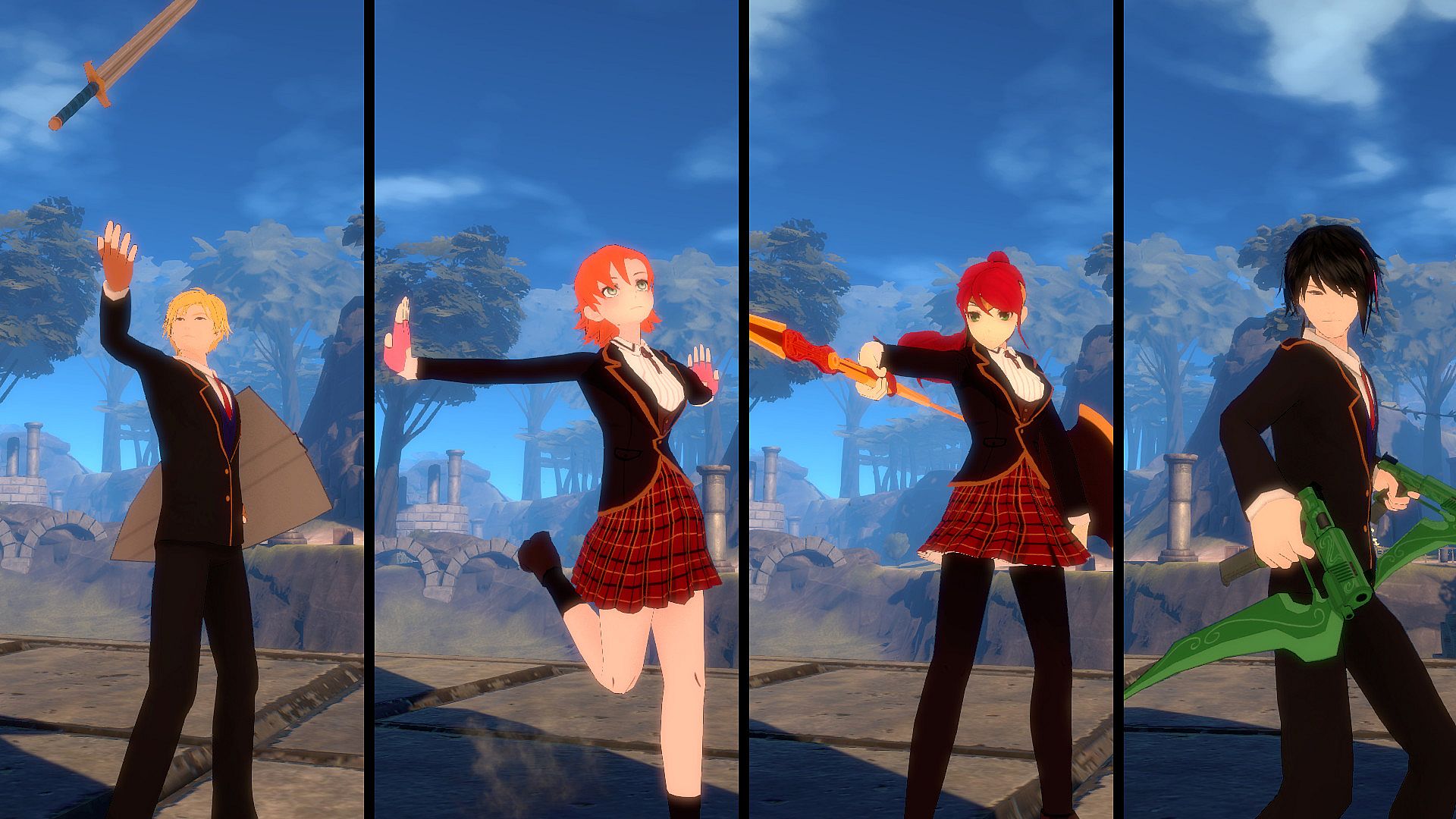 • Beacon Academy School Uniform skins for Jaune Arc, Nora Valkyrie, Pyrrha Nikos, and Lie Ren.