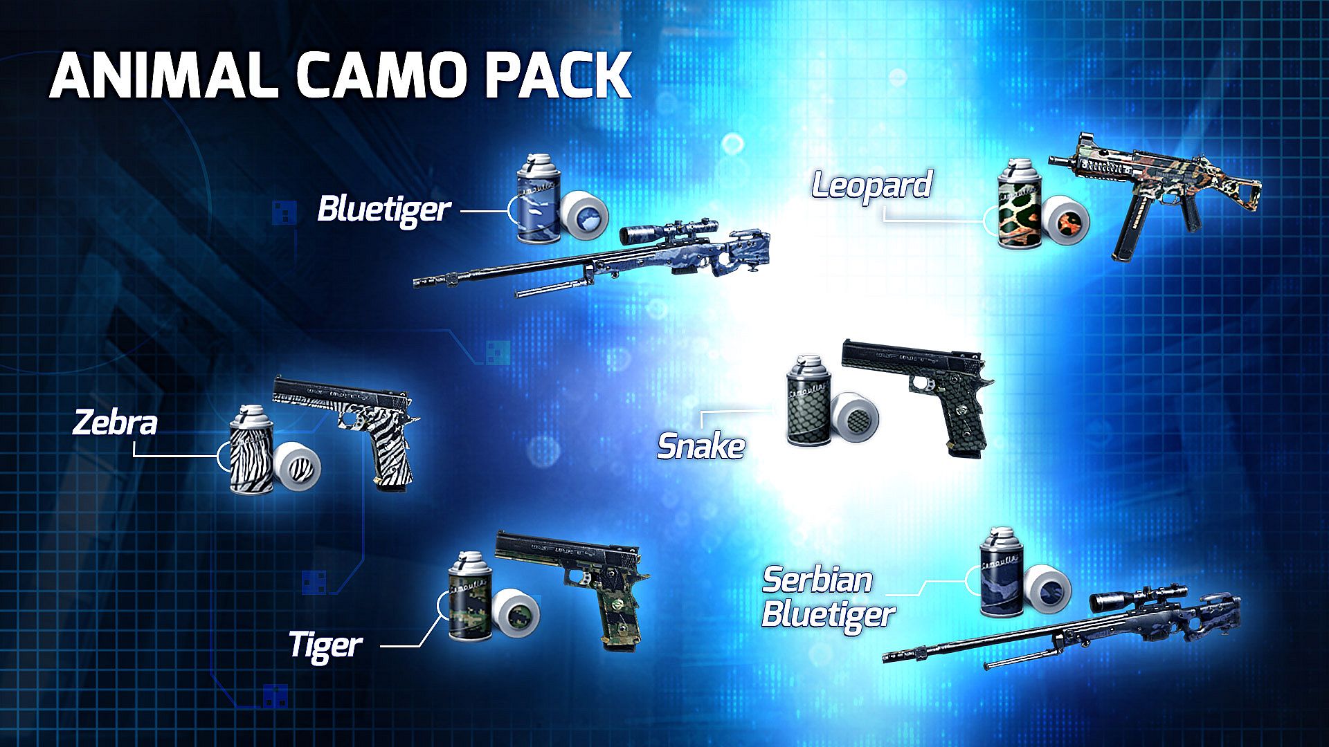 This pack contains 6 camo sprays, each usable for 30 days. These include the camo sprays 'Zebra' and 'Tiger', for example, which give your weapons a real wild look!