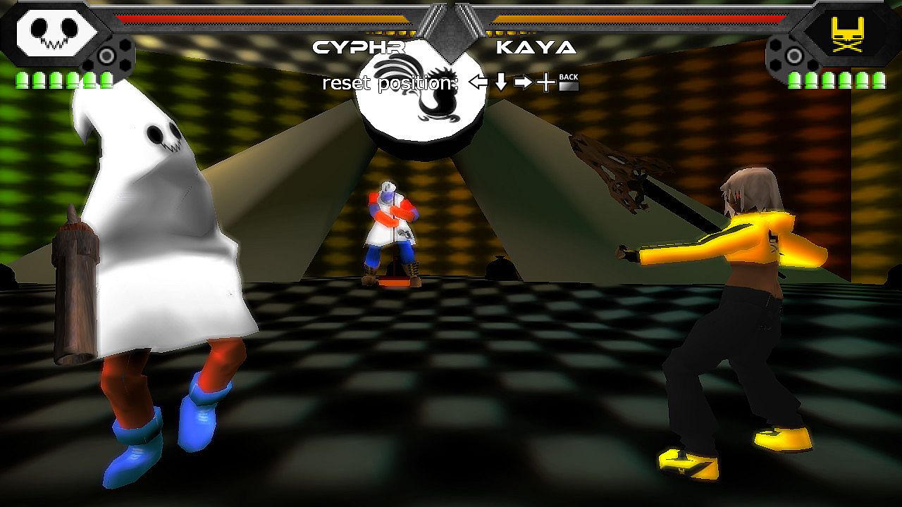 Kaya and Cyphr face off against a ghost armed with a revolver in this action-packed artist collaboration. Players equip these standout costumes-Kaya as the bald, one-eyed deliver girl wielding a Tyrannosaur mace, and Cyphr as the gun-toting ghost-while riding through Goedo. The designs come straight from Ciao (Von Krukru), adding bold flair to the experience. Unlock Kaya's Oni costume by clearing arcade mode with Jenn Husler, selecting yes at the initial unlock all characters prompt, finishing the story episode To the Source, or entering cheat codes from discussion threads. This setup suits action fans who chase unlocks and character progression in fast-paced showdowns.