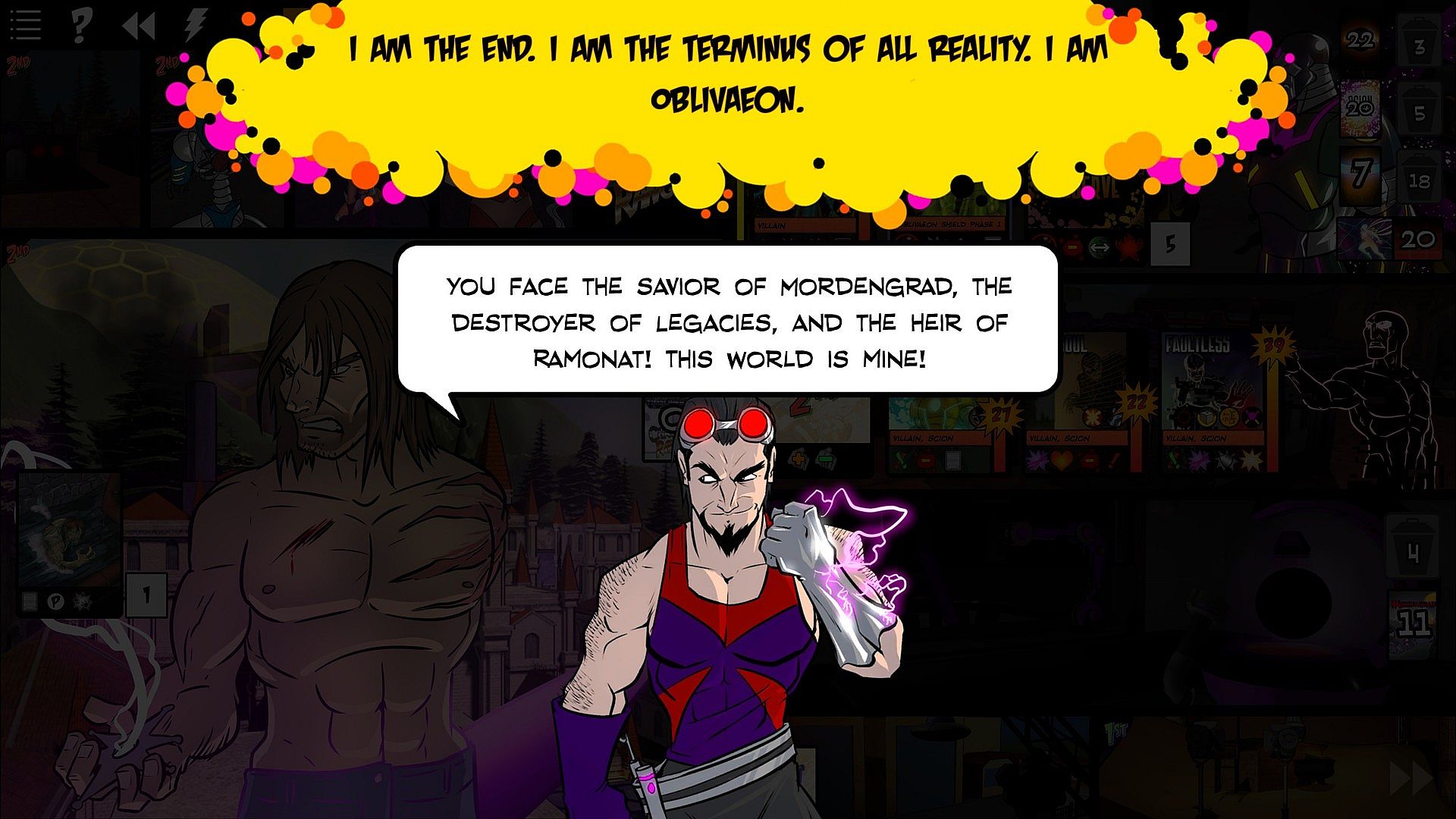 OblivAeon is a mega-expansion that provides a completely new final boss scenario. Five villains-turned-hero must join the other Sentinels and work together to save the Multiverse from its greatest foe!