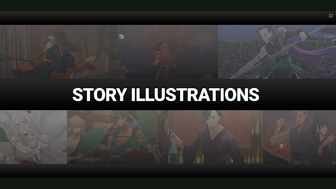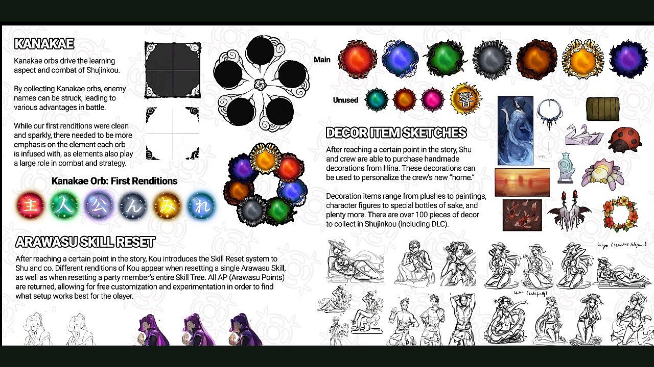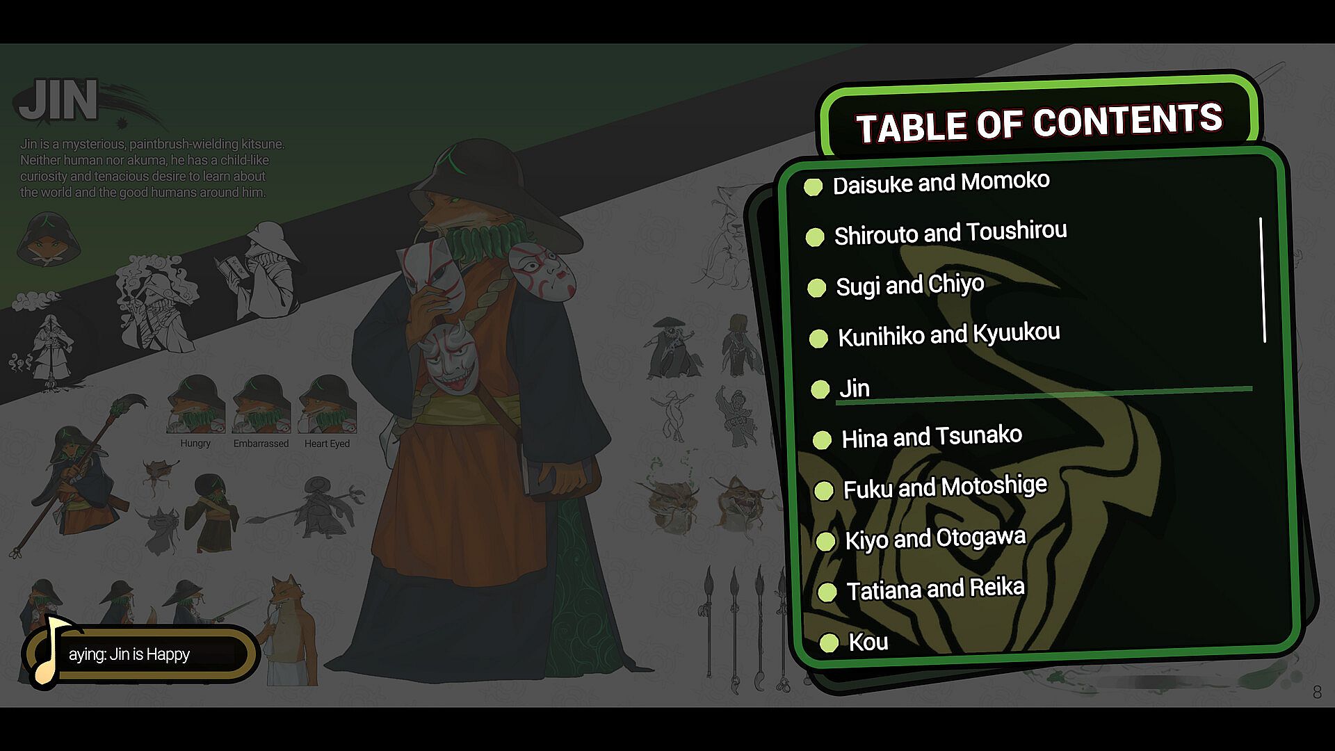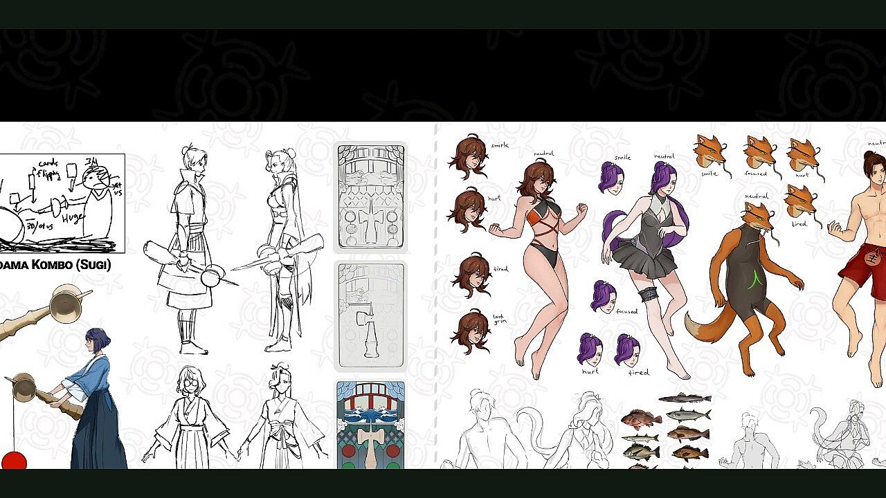 The Shujinkou Digital Artbook contains over 35 wide pages of sketches and renders for character art, enemy art, backgrounds, environments, UI, minigame art, story illustrations, and more.Take a look through a custom Table of Contents system and a selection of seven different songs to listen to as you peruse the artbook.