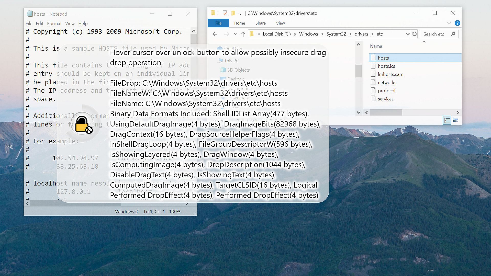 Allows a prompt for drag and drop to windows with administrator rights.- The operating system does not allow drag and drop functionality from a regular app to a secured app. When enabled, the tool will detect when you are trying to do this, and a drag and drop security converter window will appear. If you want to override the security measure, you can place the cursor over the unlock button until it unlocks. At this point, the tool takes over the cursor in administrative mode, preventing programs with lower access levels from forcing the drag drop to complete. You should now be able to complete the drag drop into programs that were previously blocked.