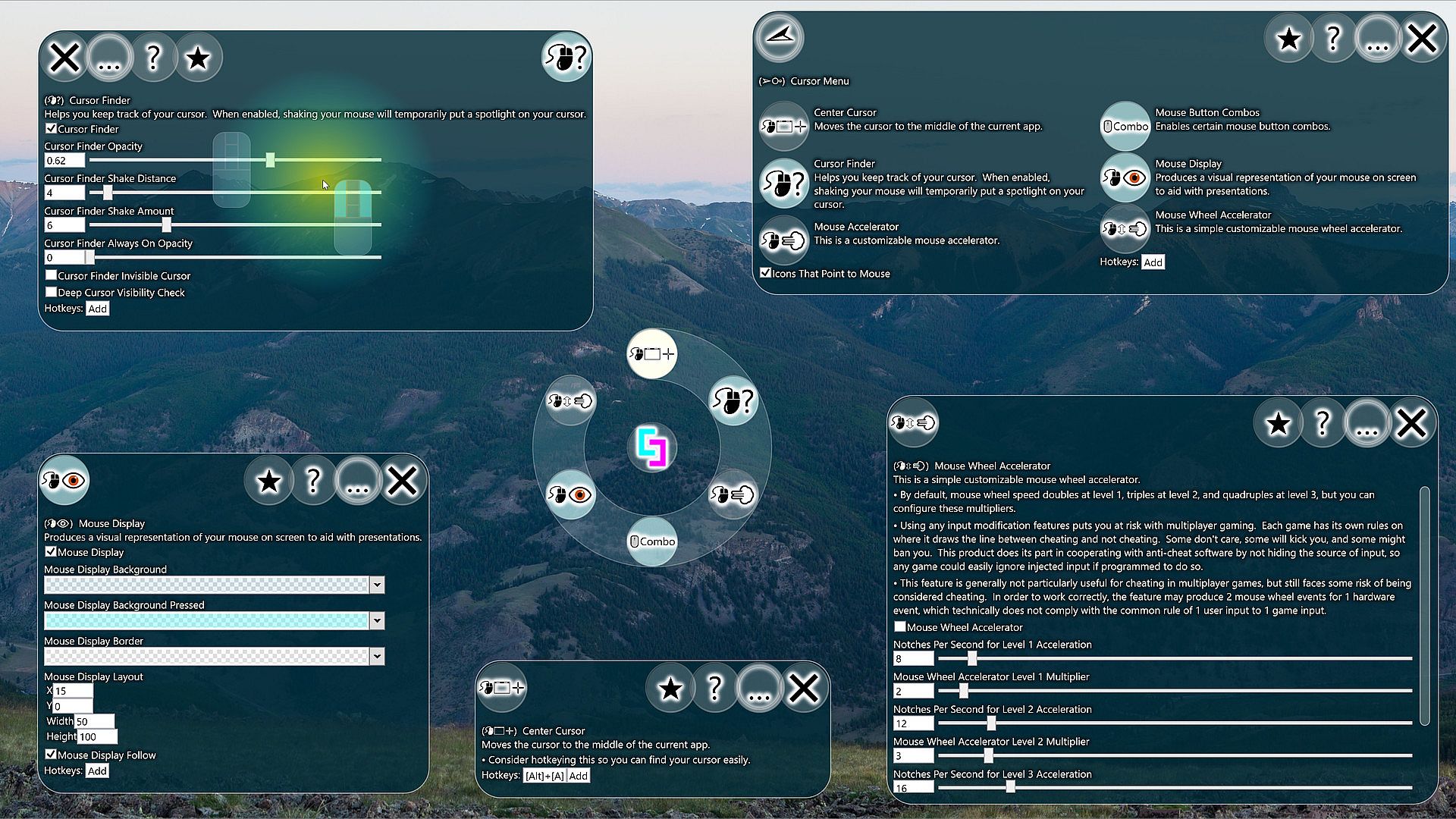 Contents: Mouse Display (), Cursor Finder (?), Mouse Wheel Accelerator (⇳), Mouse Accelerator (), Center Cursor (✛)