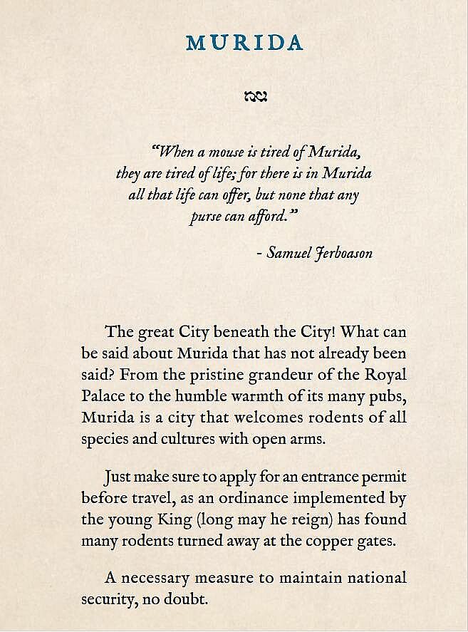 • An explanation of how to properly follow Rodentian customs. When is it acceptable for a mouse to pay tribute? How should one follow the Old Way? And what's the deal with all the statues?