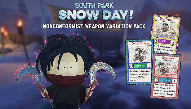 Abandon standard daggers for these sinister sickles in SOUTH PARK: SNOW DAY! Drain vitality from foes and channel it to fuel your inner shadows. This dagger reskin brings upgrade cards plus grim new looks like a nonconformist hairstyle, tunic, scarf, and cape.