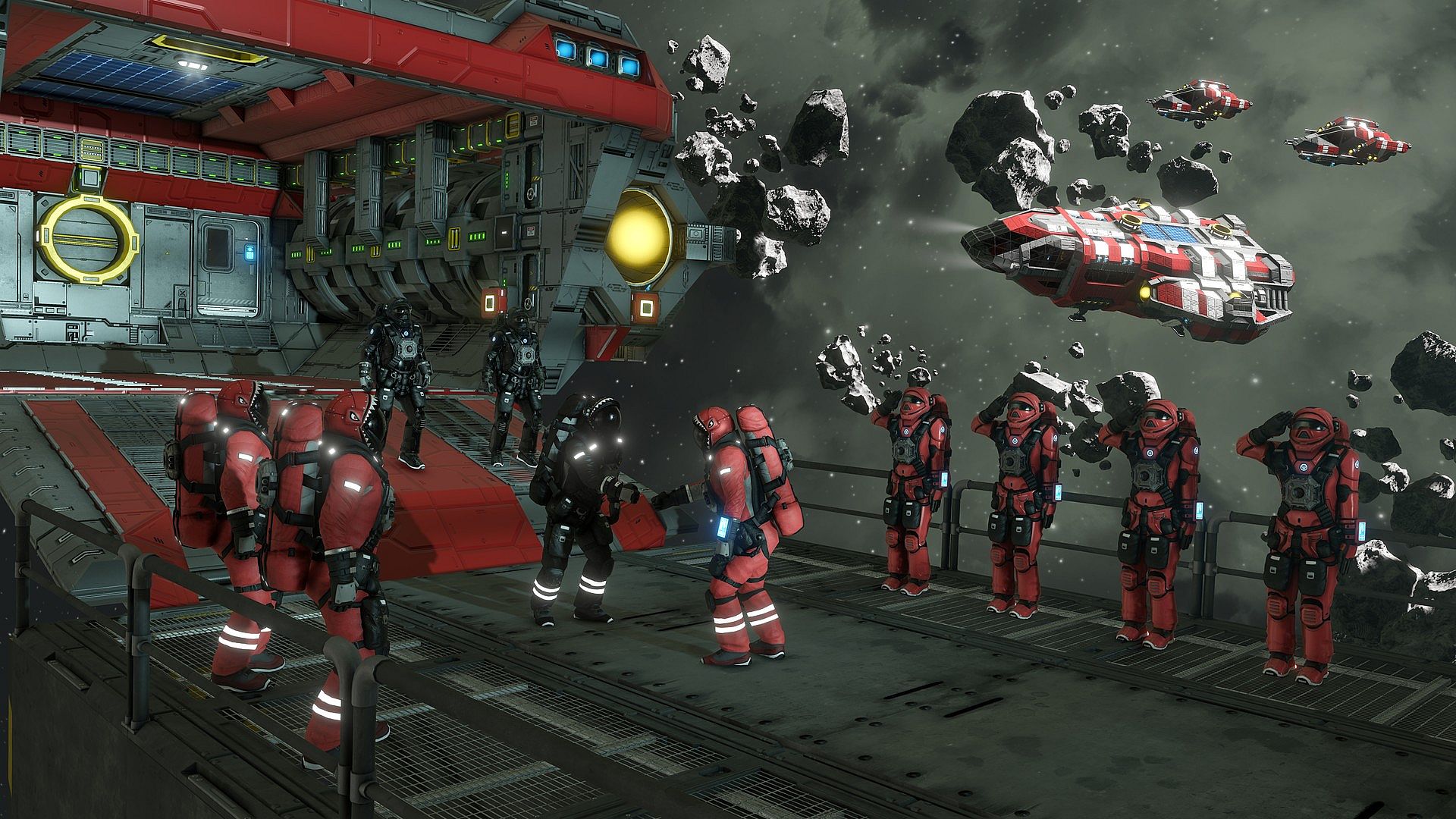Space Engineers Space Engineers: Warfare 2 “Broadside” pack includes Warfare Ion Thruster, Warfare Reactor, Warfare Hangar Door variants, Warfare Rocket Launcher, Warfare Gatling Gun, Searchlight, Bridge Windows, Passenger bench, Light panel, Helm, Warfare Battery, Heat vent, Sliding Hatch Door, Woodland Camo Armor Skin, Shark mouth helmet skin, “Rock paper scissors” emotes, “Salute” Emote