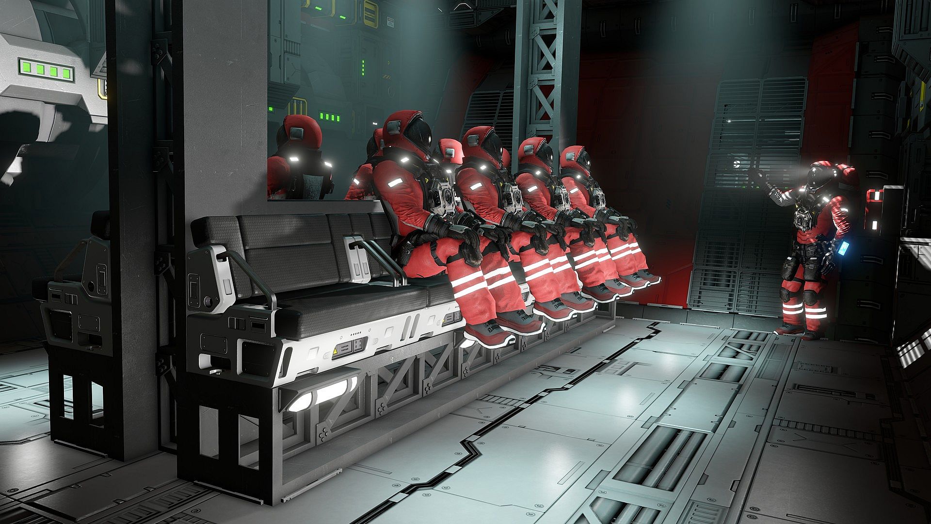 Troop carrier style passenger seat. Multiple seats can be arranged as a bench. Designed to seamlessly fit together and provide seating for multiple engineers.