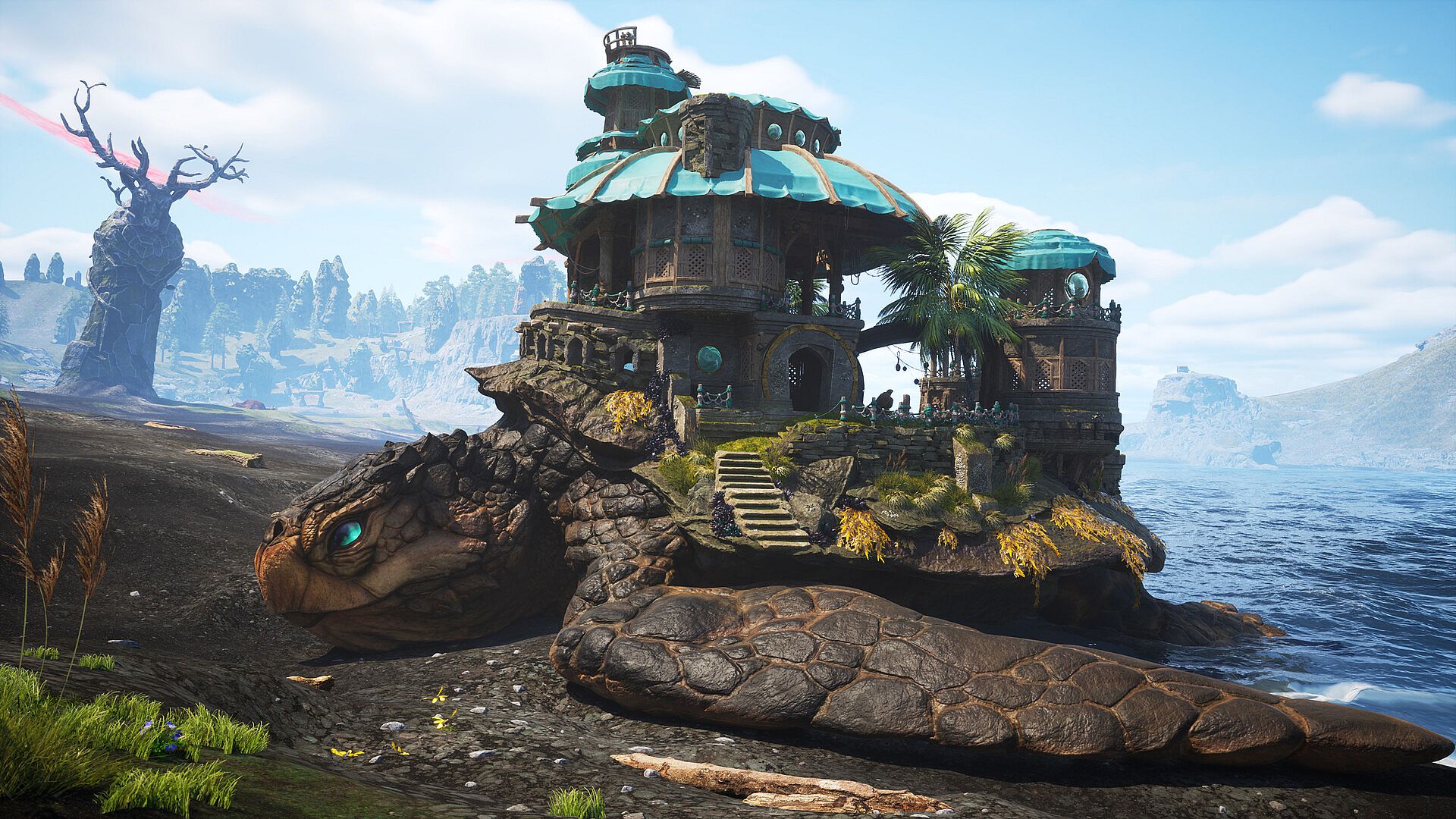 An ancient guardian rises from the deep...The Turtle Island Home DLC introduces a one-of-a-kind player home perched on the back of a colossal sea turtle. After completing a short quest on the beach between Misthaven and Mosswood, players gain access to this mystical creature—whose shell holds a fully equipped sanctuary. As you unlock new regions, the turtle can relocate to them, offering a fresh perspective on your journey through the ancient world. This tranquil home includes all standard amenities—bed, banker, portal, mirror—but also features a tower-top spyglass that reveals hidden secrets in each region. Use it to uncover the four exclusive cosmetic rewards: two character skins (Waterspout and Red Marble) and two eye colors (Afterglow and Baby Blue), each tucked away in secret locations visible from the turtle’s vantage. This DLC transforms how you experience the world—offering a serene, mobile refuge to enhance the main story.