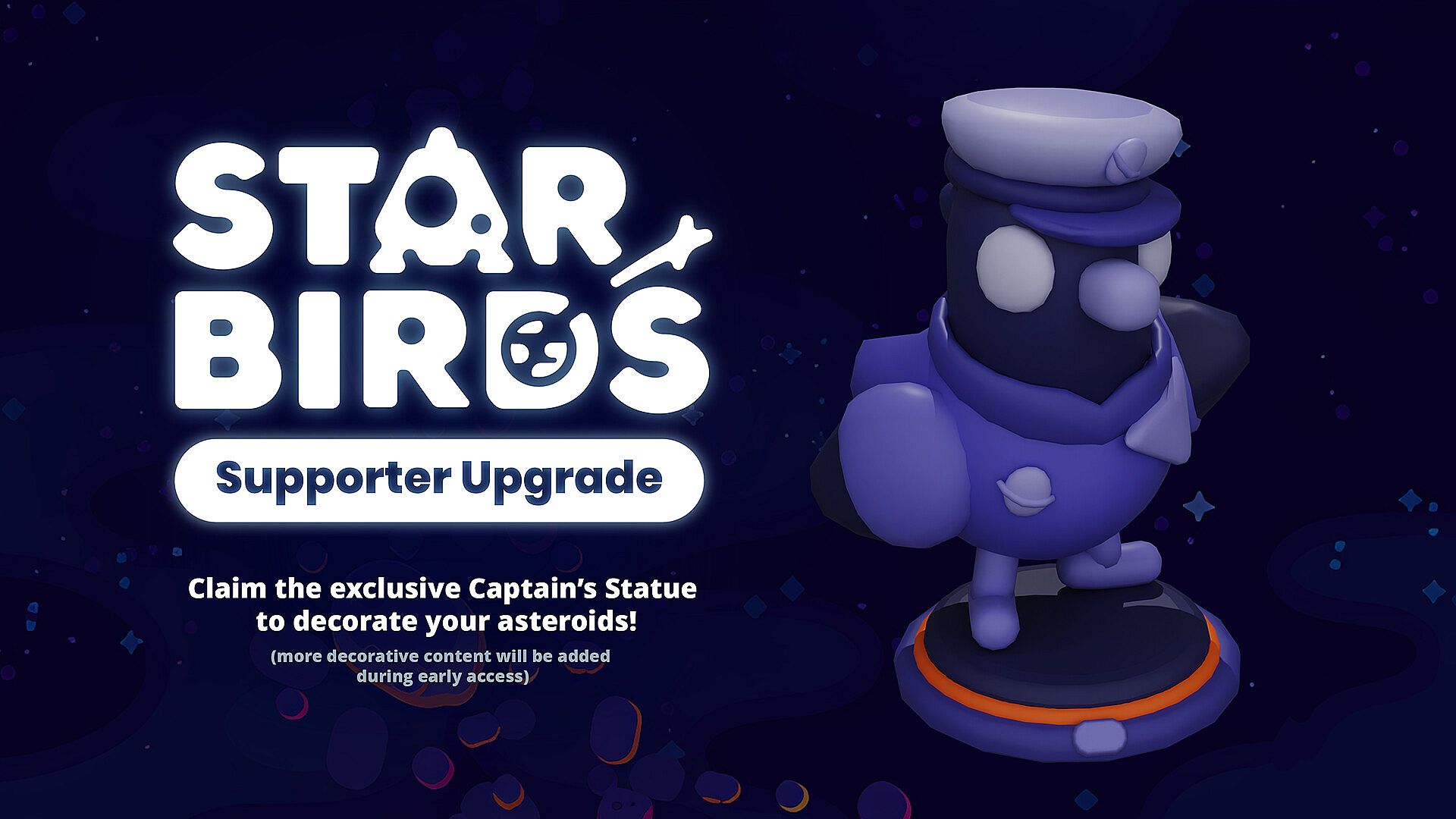 With the Supporter Upgrade you’ll unlock exclusive decorative content for Star Birds — starting with a Captain’s Figure to place on your asteroids. More unique items will be added throughout Early Access leading up to the full release.