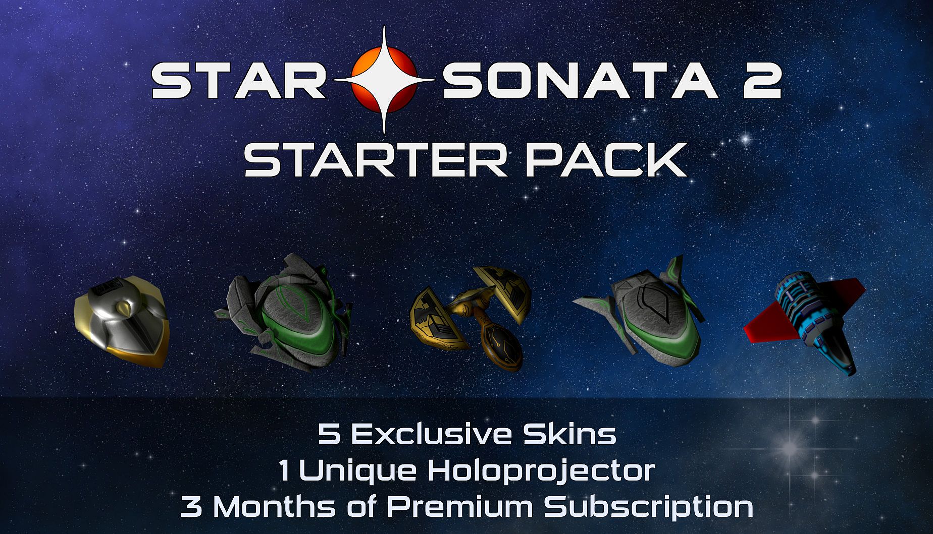 Get a headstart on your Star Sonata experience with 3 months of premium subscription time, 5 unique and Steam exclusive ship skins, and a special holoprojector! Launch into the universe in style!