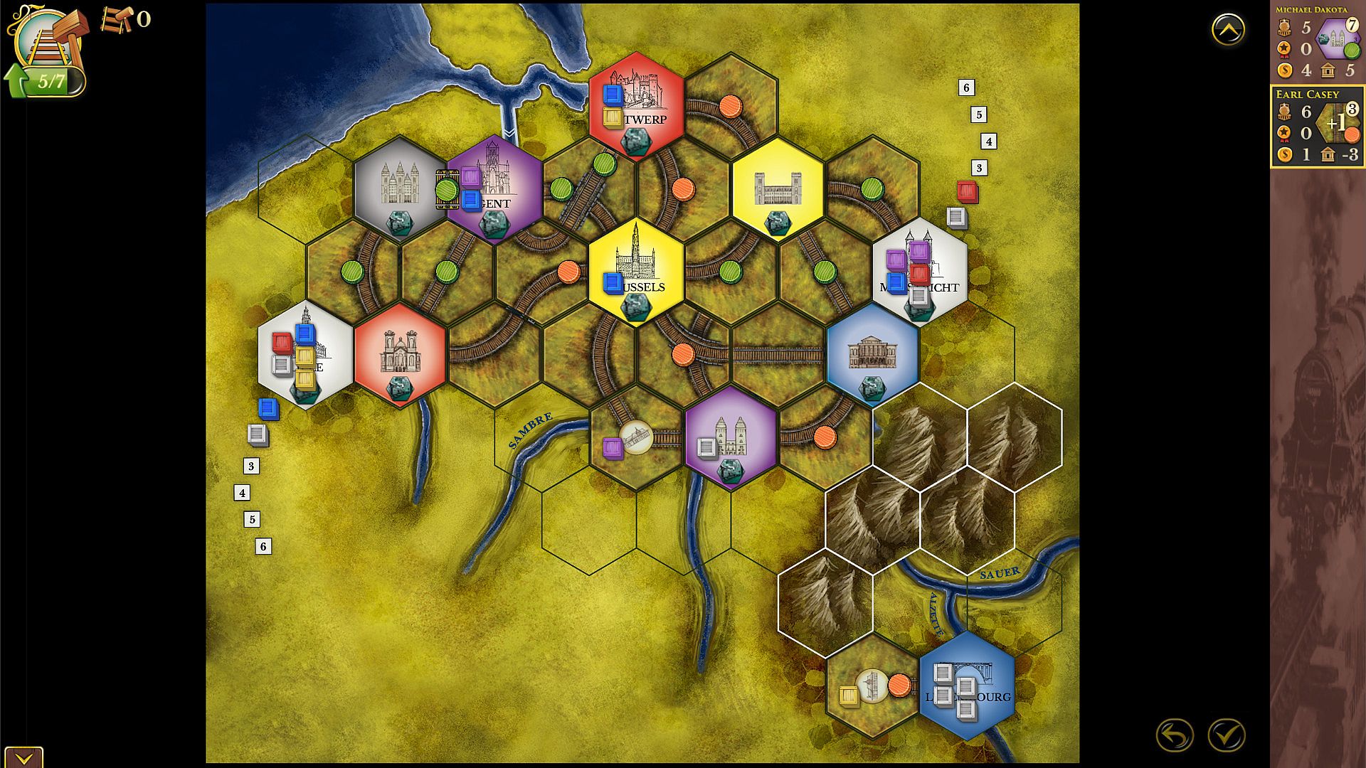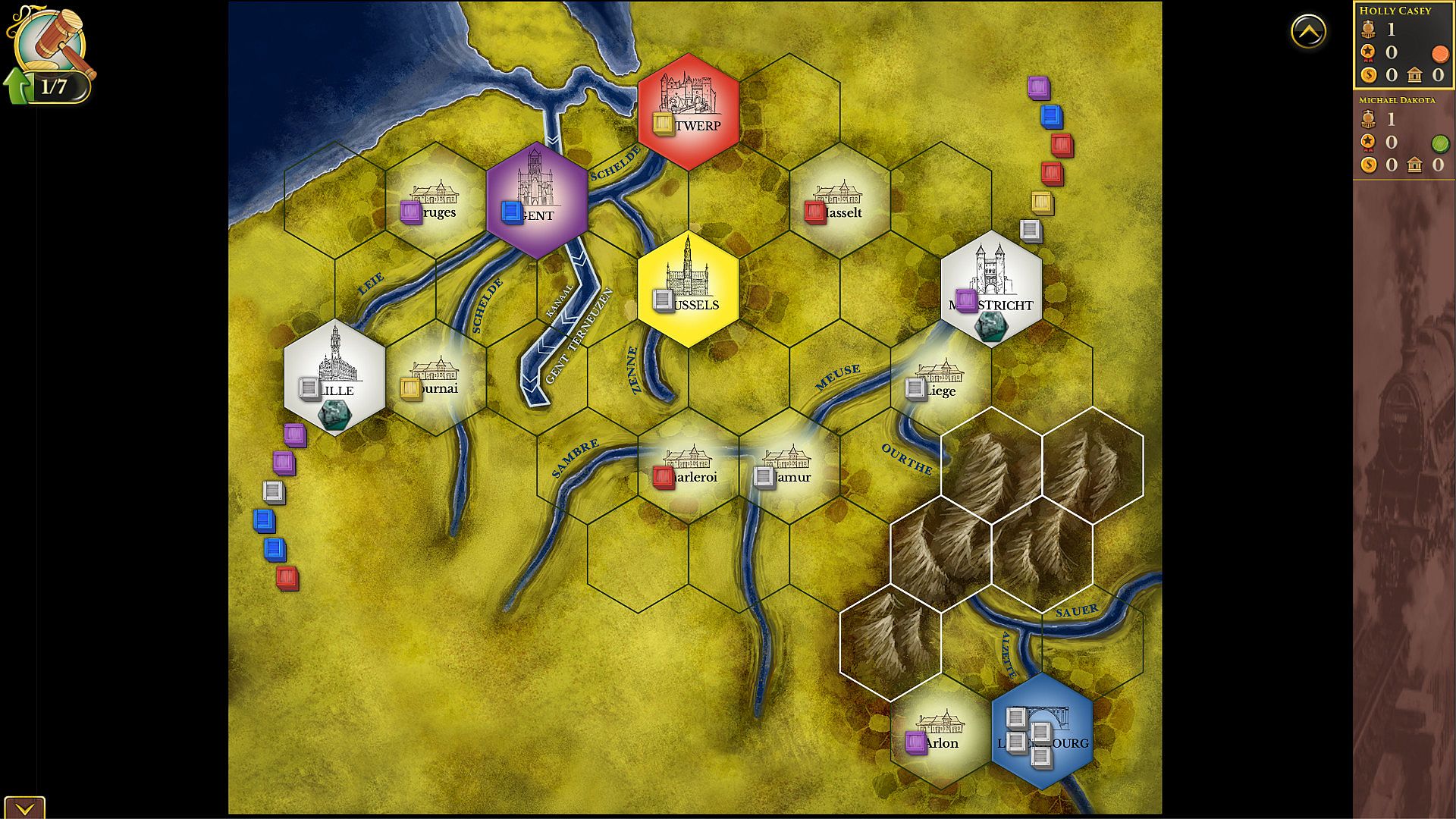 - White cities are Foreign cities that you can only import from. You may never deliver Goods cubes to, or transport Goods cubes through these cities. Once you import any Goods cubes from a Foreign city, importing cubes from the other Foreign city is prohibited for you for the rest of the game.