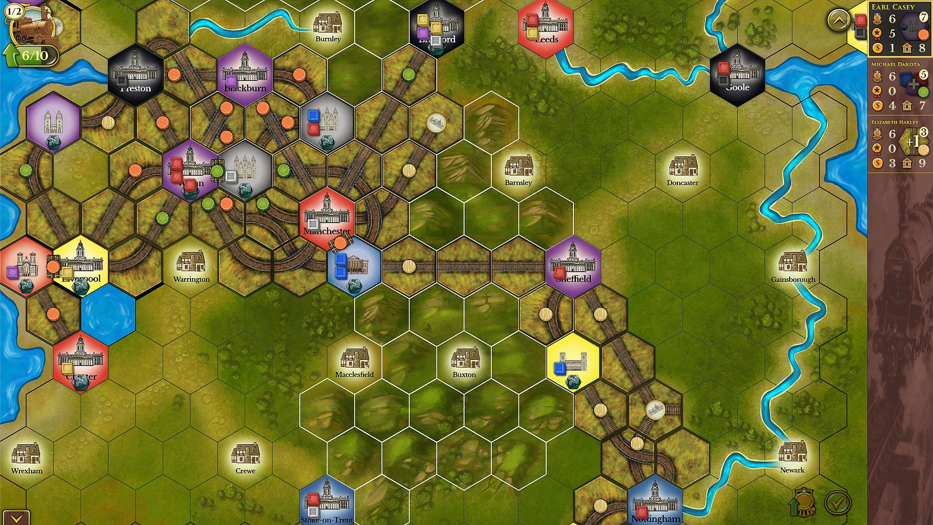 - ️ Densely arranged cities and towns often occupy adjacent hexes. You can connect adjacent cities with a new token (cost $3).