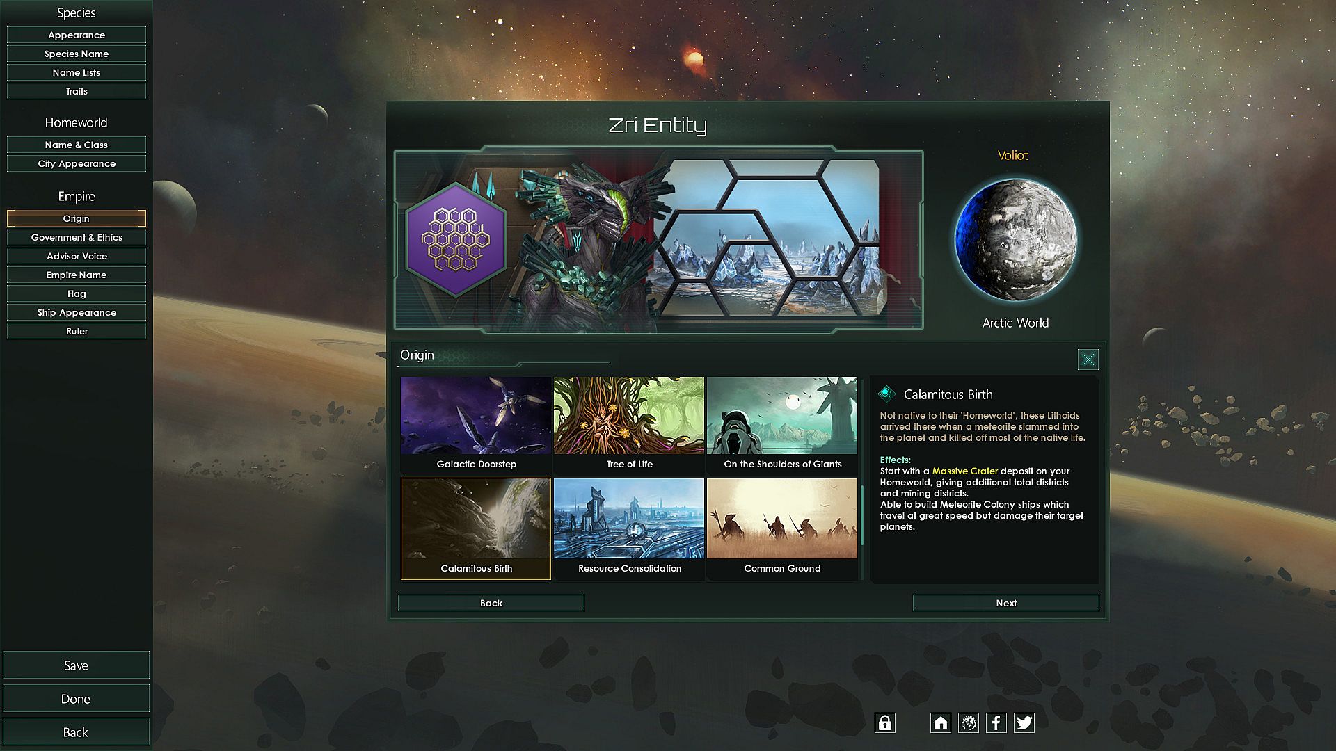 - Origins: Each empire has a story that shapes its path. Give your civilization deeper roots with the new system of Origins. By choosing an Origin, players can flesh out their empire’s background and alter its starting conditions. Whether it’s Void Dwellers who have abandoned their homeworld to live in perpetual orbit, or a society that worships and protects a powerful Tree of Life, you can lay the groundwork wisely for the seeds of your empire.