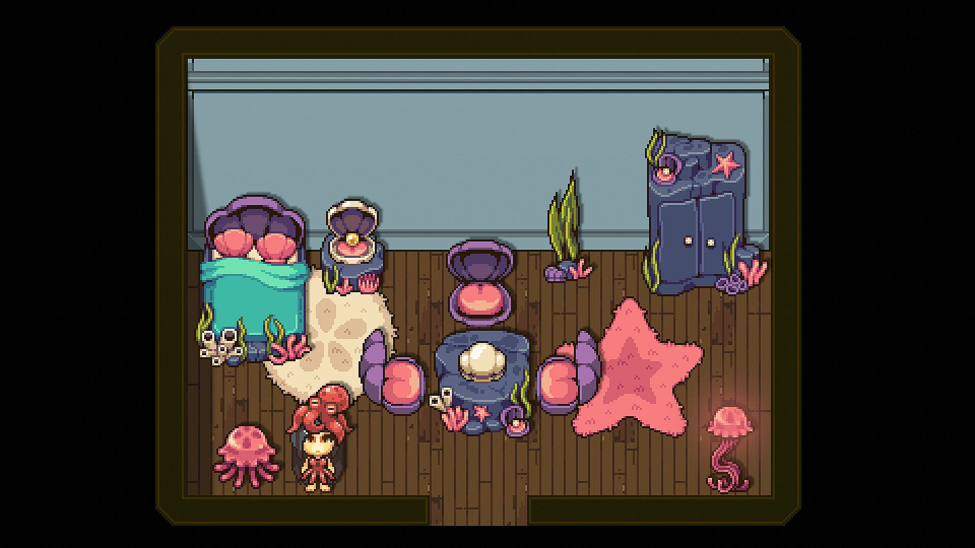 • Underwater Furniture Set: Underwater Clam Chair, Underwater Nightstand, Underwater Table, Underwater Wardrobe, Underwater Bed, Sand Dollar Rug, Starfish Rug, Jellyfish Lamp, Hidden Pearl Clam, and Small Seaweed