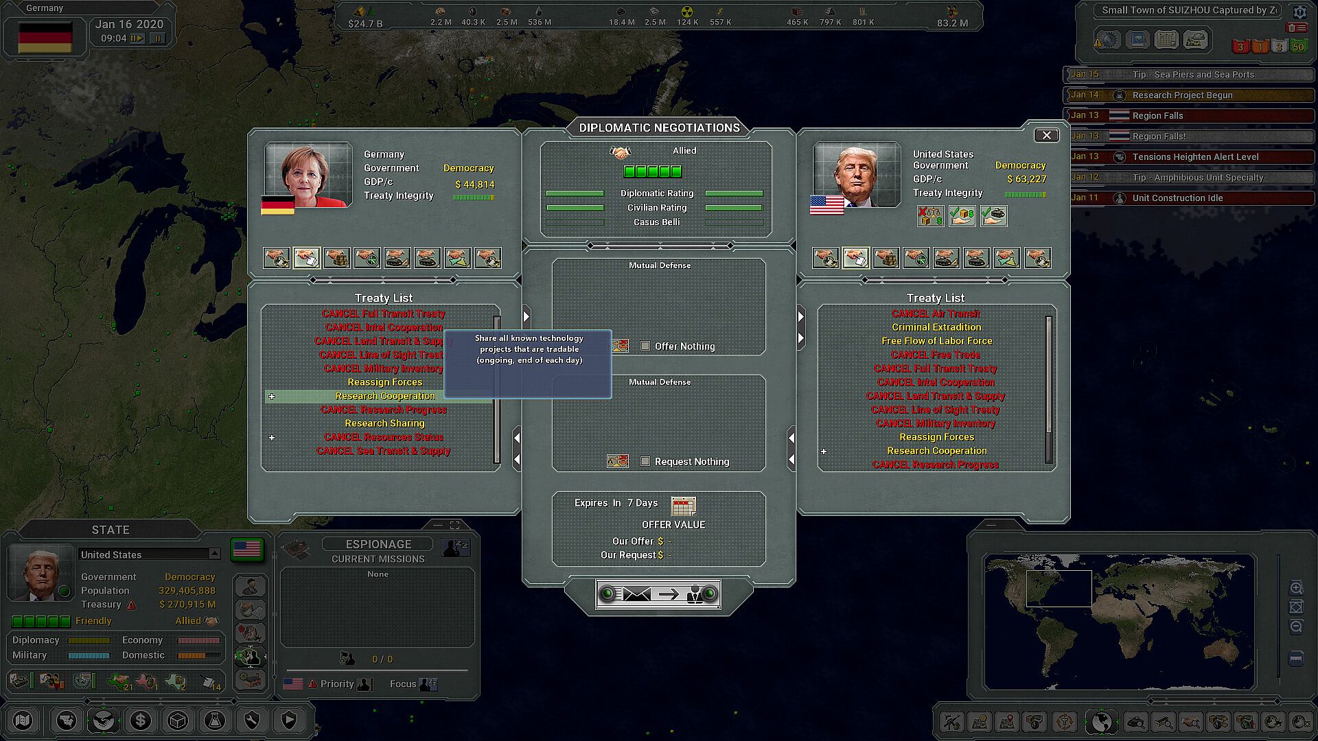 Country management also requires managing relationships. Allies or enemies can be found next door or half way around the world. Sign treaties, trade commodities and share research to rise in power, or help others fight the new global challenges.