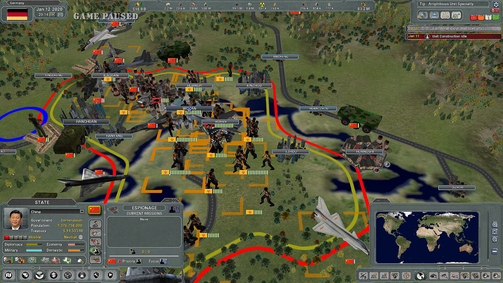 Choose your country and manage their army, air force and navy around the world. Research, produce, buy and sell military equipment to optimize your armed forces and generate extra revenue. Each land unit is a battalion, each aircraft a squadron. Assemble battlegroups of combined force abilities to counter enemy tactics. Deploy your naval battlegroups as fleets to protect your maritime borders from naval landings by enemy nations. Load your units with far reaching missiles, either conventional or nuclear, to strike at the enemy from afar.