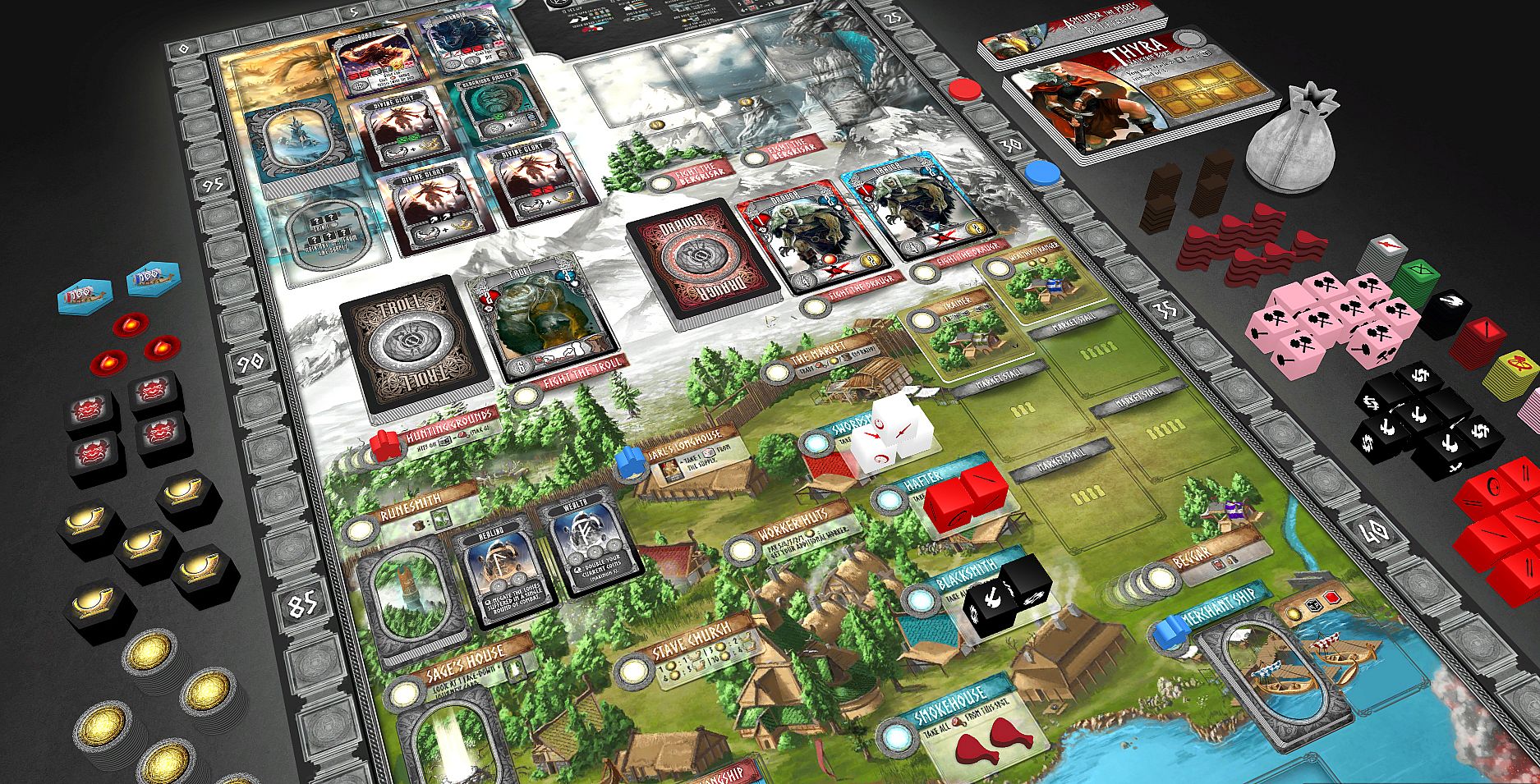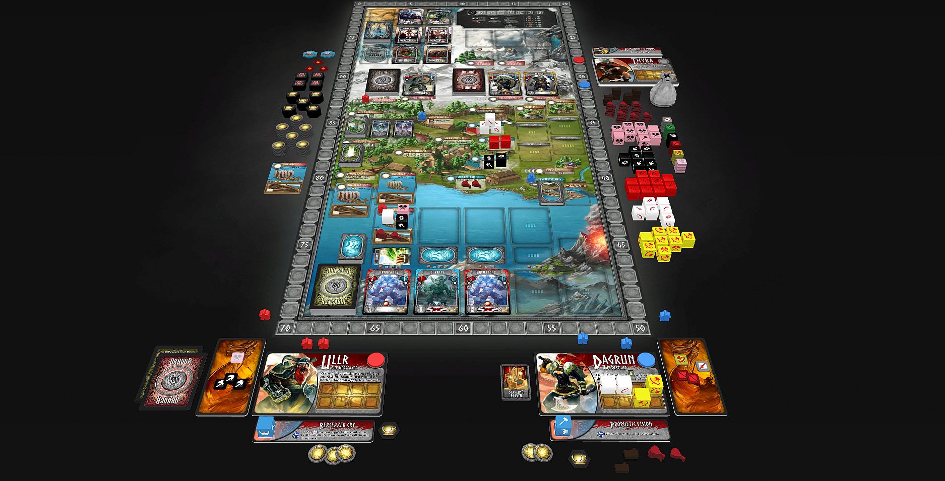In Valhalla, fallen warriors led by the Valkyries fight alongside Odin and feast with Freyja for all eternity. Nothing is more glorious to a fallen Viking warrior than entering the halls of Valhalla. At Odin’s side and in Freyja’s field, death doesn’t seem so bad.In this expansion for Champions of Midgard, players earn sacrifice tokens for the deaths of their warriors. These sacrifices turn into opportunities for the living in the form of powerful blessings and stronger warriors ready to join your clan and aid you in your quest for glory! By defeating epic monsters in the afterlife and using the blessings of the Valkyrie, you will discover even more ways to gain glory in Midgard.