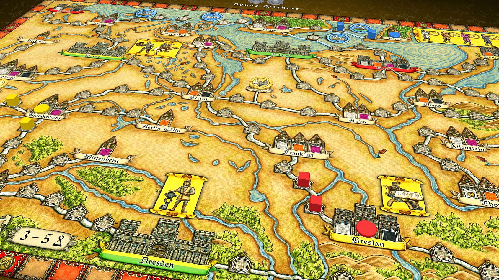 Players attempt to increase their standing as merchants in the Hanseatic League by gaining prestige points. This may be done in different ways: Establishing a network of Kontors in new Hansa cities may be as promising as improving trading skills.
