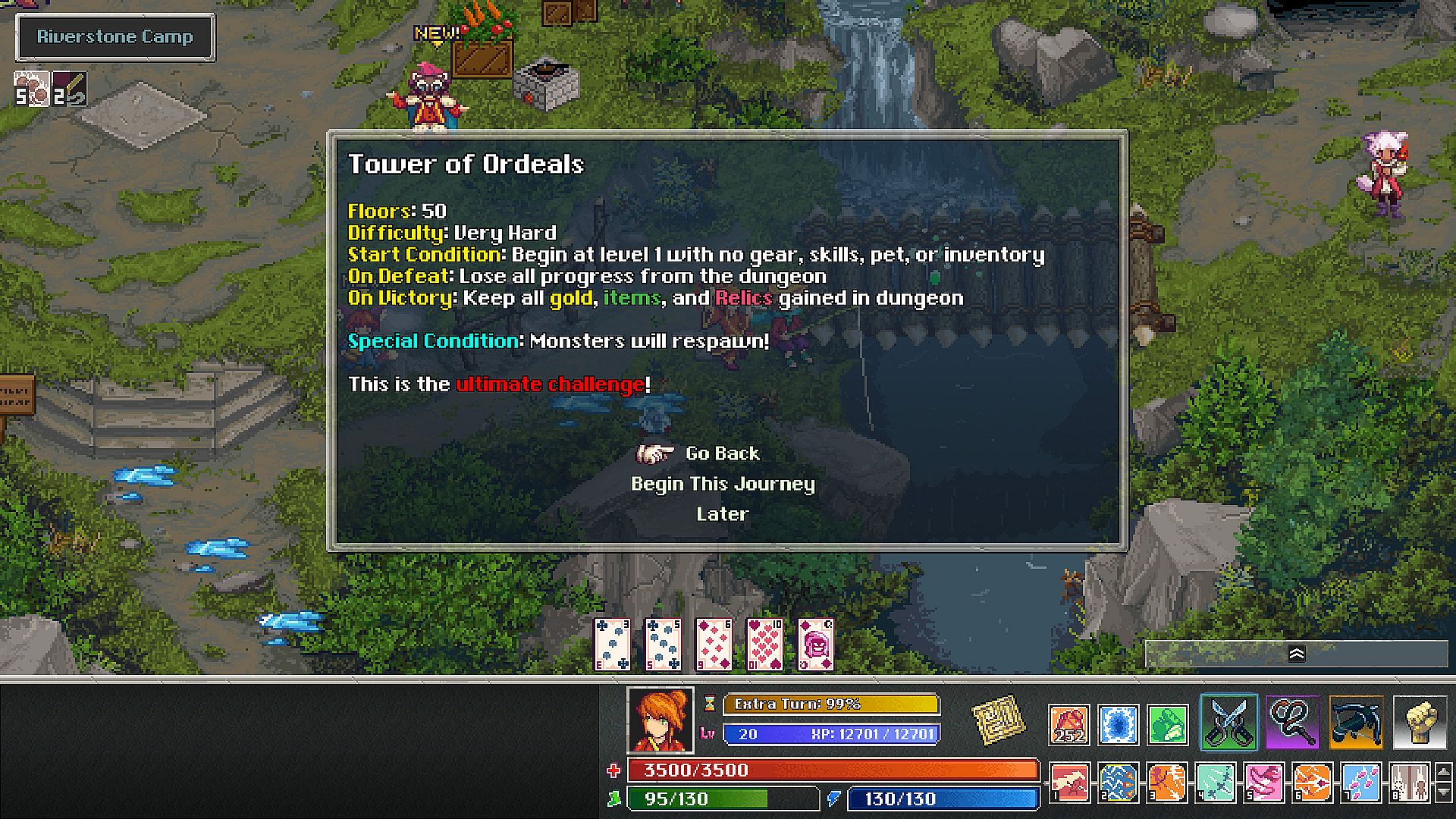 You may now encounter a new character in Riverstone Camp: the Mysterious Wanderer. This enigmatic storyteller will introduce you to “Wanderer’s Journeys”: randomly-generated adventures that range from 10 to 50 (!!!) floors.UNIQUE DUNGEONS