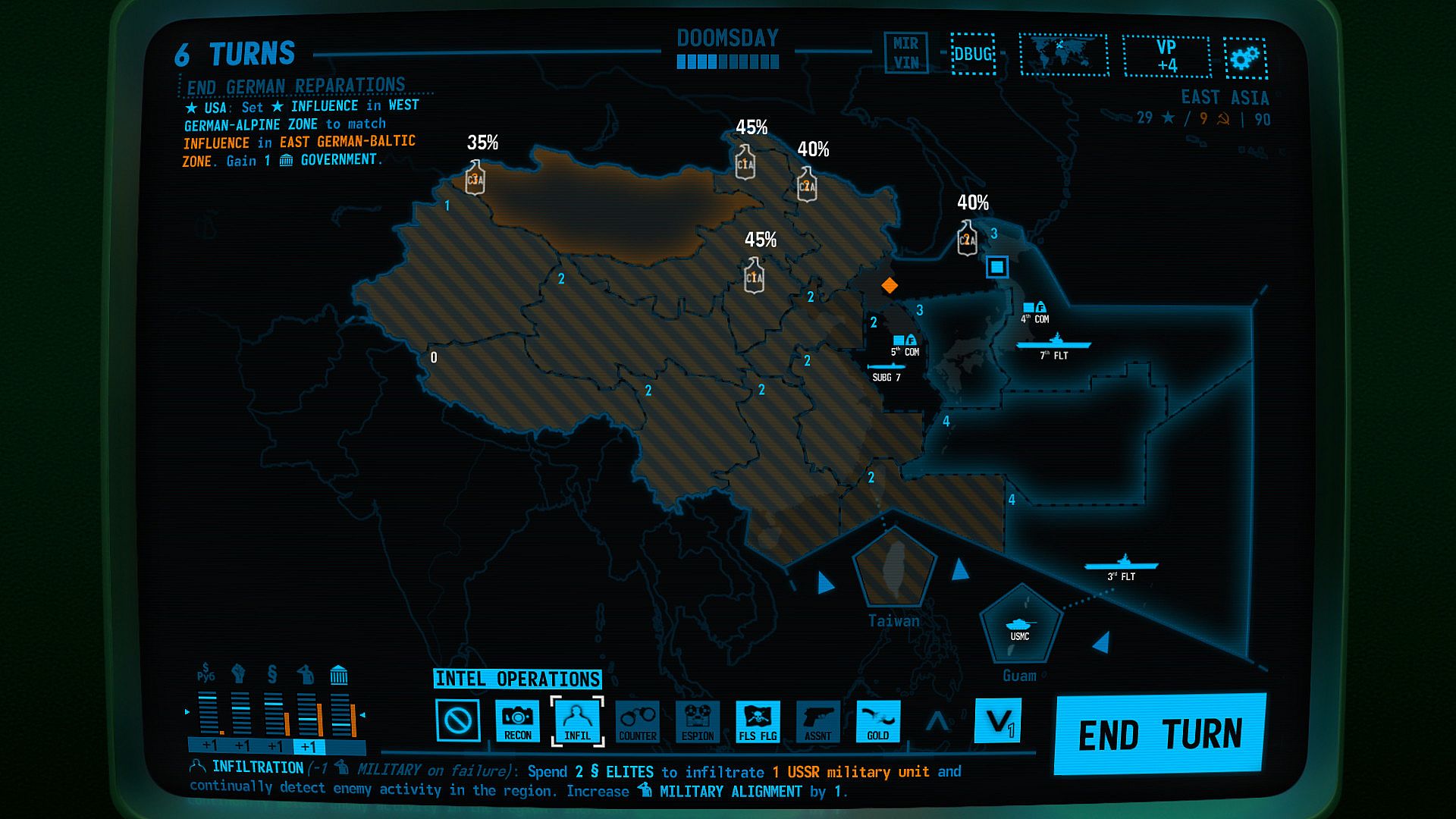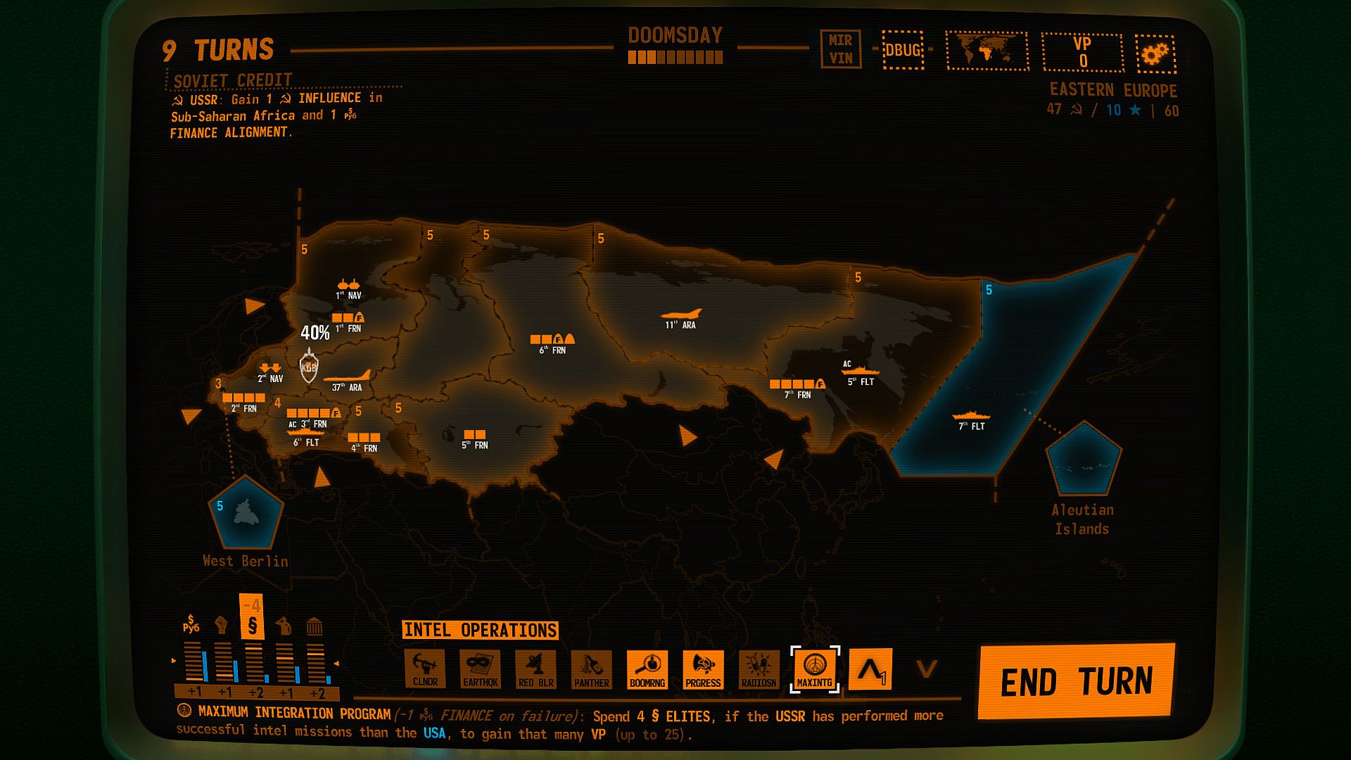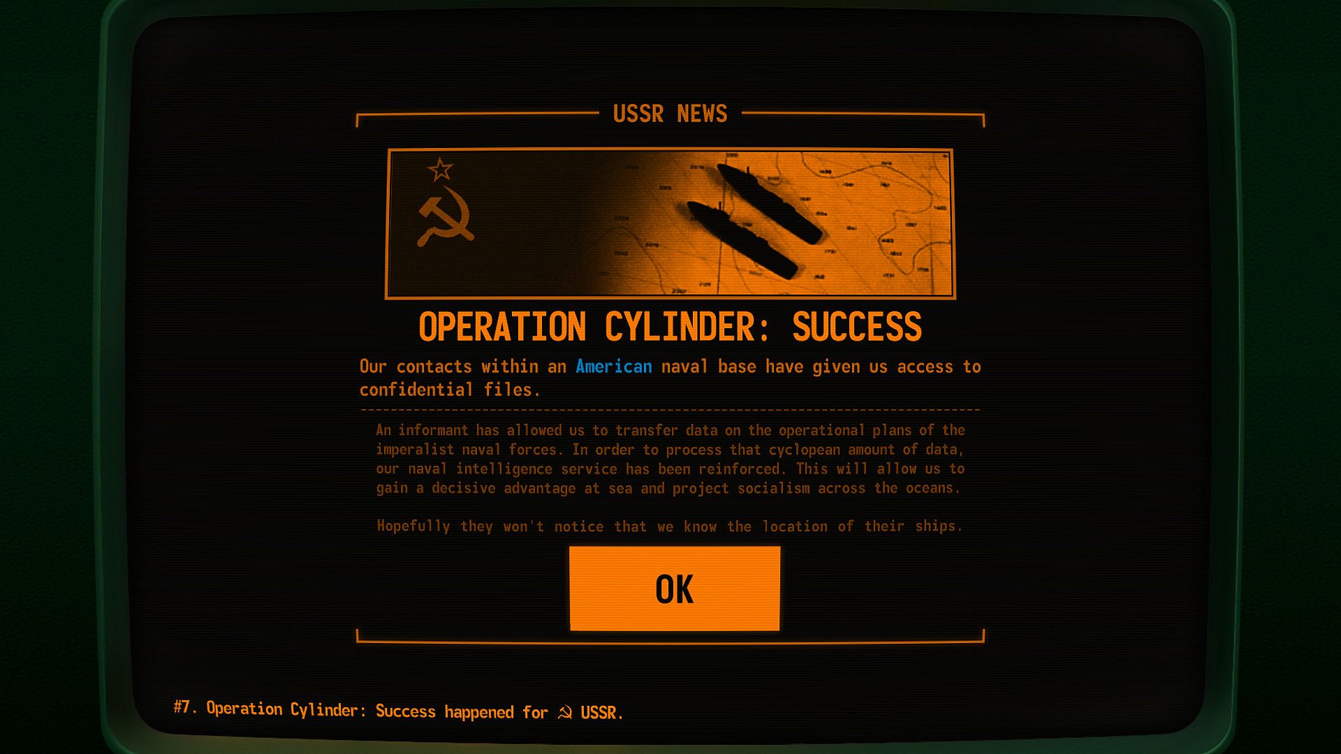 Throughout the game, certain unique opportunities will arise for dangerous espionage missions. These have powerful and unique effects in the game, such as being able to take enemy submarines out of service and catching up in the nuclear arms race. You only have one shot to pull these off and the consequences for failure can be devastating, so plan carefully!Unique Domestic Programs USA & USSR