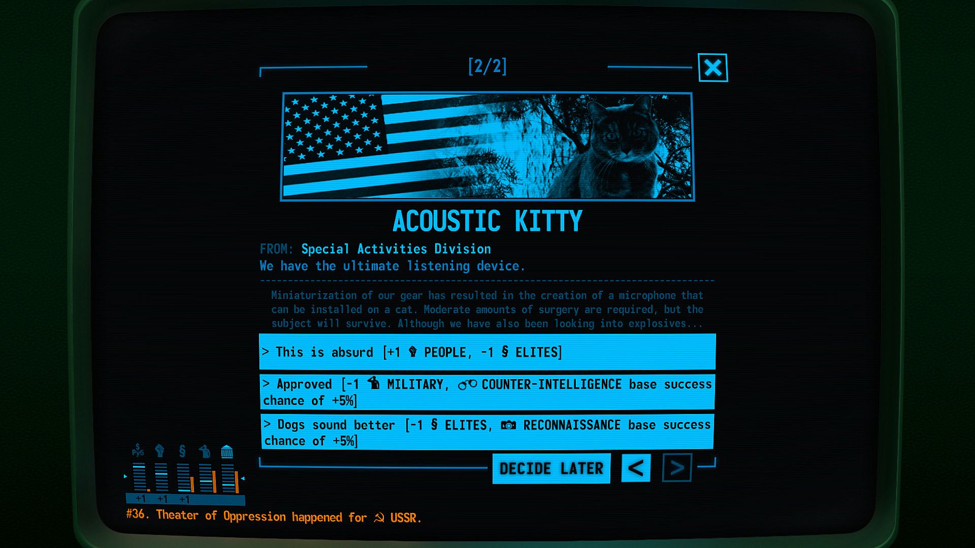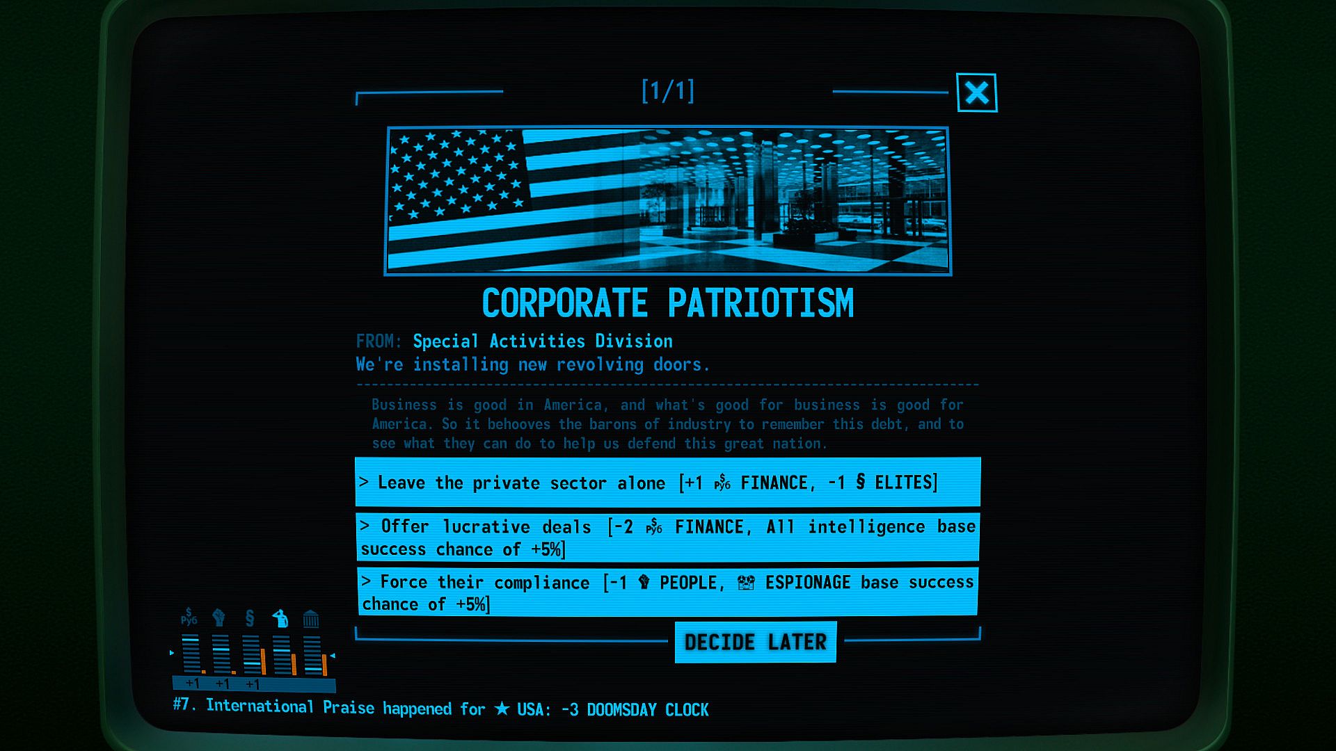 Within your own territory, it will now be possible to fund wide-reaching programs, many of which are of an ethically dubious nature. This includes being able to intercept the communications of your own populace and even look into the creation of super soldiers and supposed extra-sensory abilities. If you don't mind the possibility of your citizens finding out of course.International Crises
