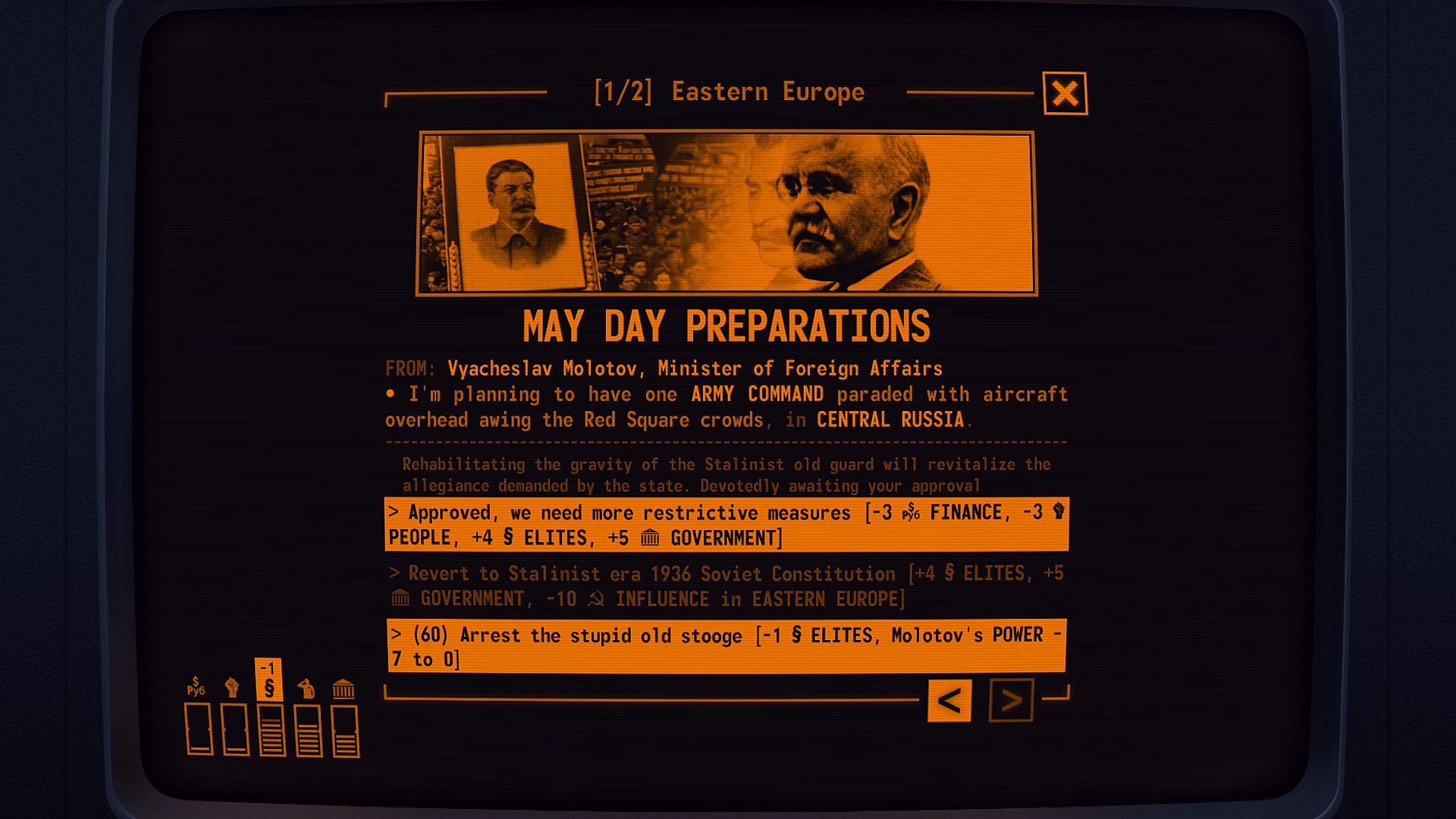 Three unique USSR policies in your home theater of Eastern Europe that can be enacted.Decisions: