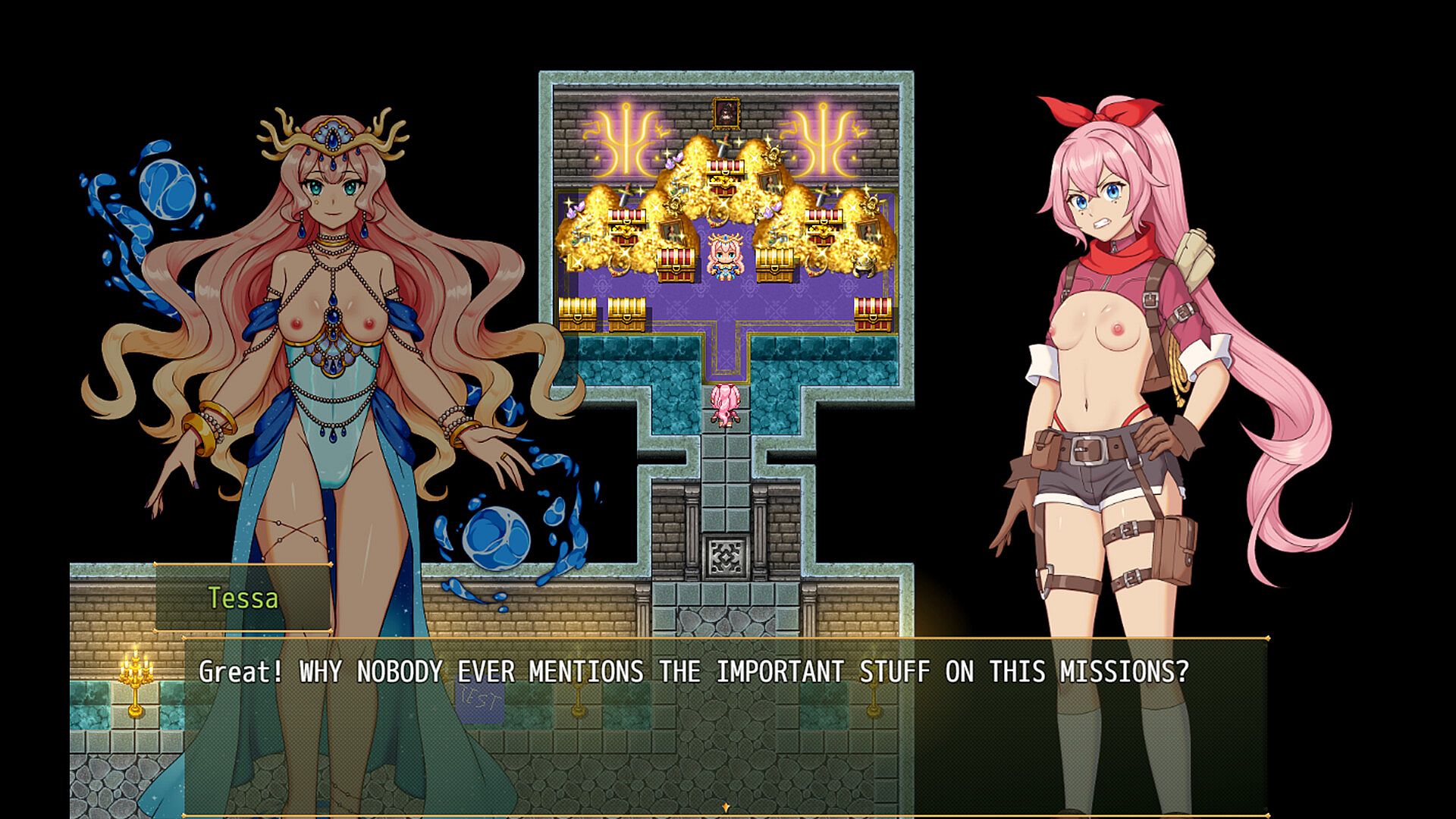 This casual RPG adventure DLC updates female character sprites across the game. It reveals their boobs on all such characters as a permanent change. No genitals appear in the visuals. Players see clothed versions again by removing the DLC.