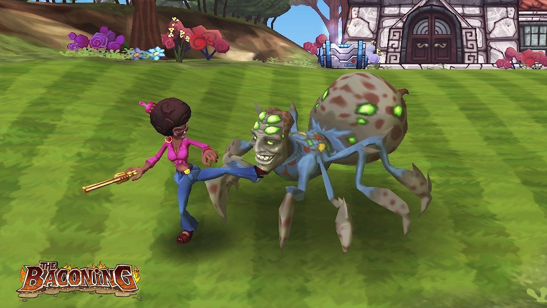 A 70's era inspired police woman with a nasty attitude and an over-sized pistol. Roesha gets results! When her gun is simply not enough she calls on her electric disco ball to take down a big crowd (watch them dance!). She can also fire First Aid shells at DeathSpank to heal her crime-fighting partner. And when she taunts, get ready for a Charlie's Angel inspired pose and some Roesha attitude. She is One Bad Mutha