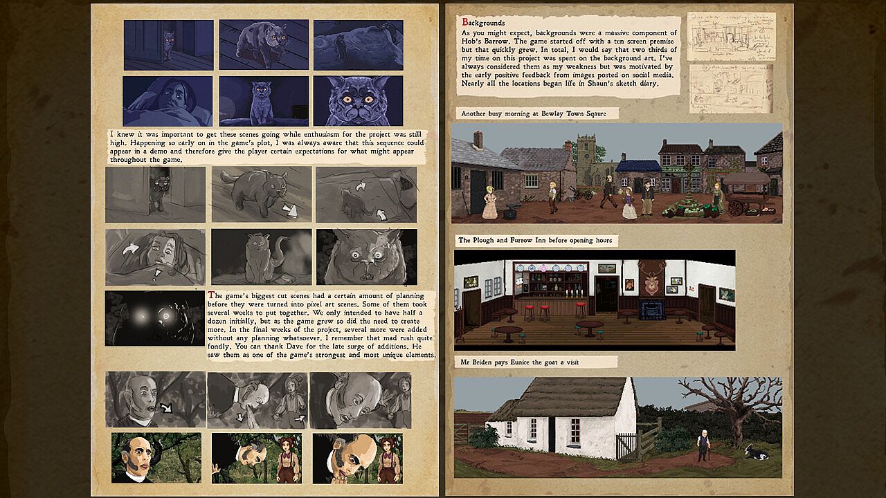 Explore the world of Hob's Barrow in full detail through pages filled with concept art, character studies, promotional material, pixel art designs, fan-art, storyboards, unused cut-scenes, and much more!