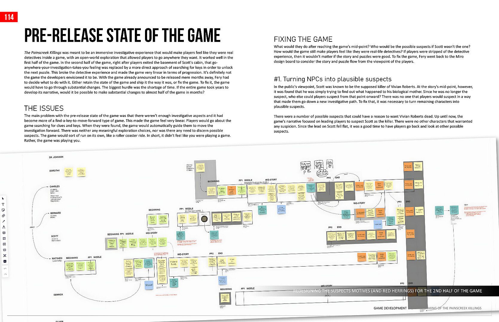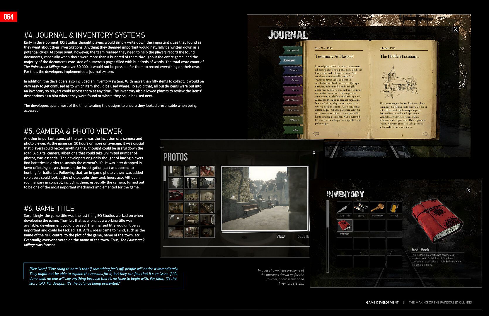 The Making of The Painscreek Killings is a 206-page digital book for fans of the game. The purpose of this book is to provide a look into EQ Studios' journey in designing a detective walking simulator. The book includes an introduction, the history of EQ Studios, stages of game development, post launch period and life after the game's release.