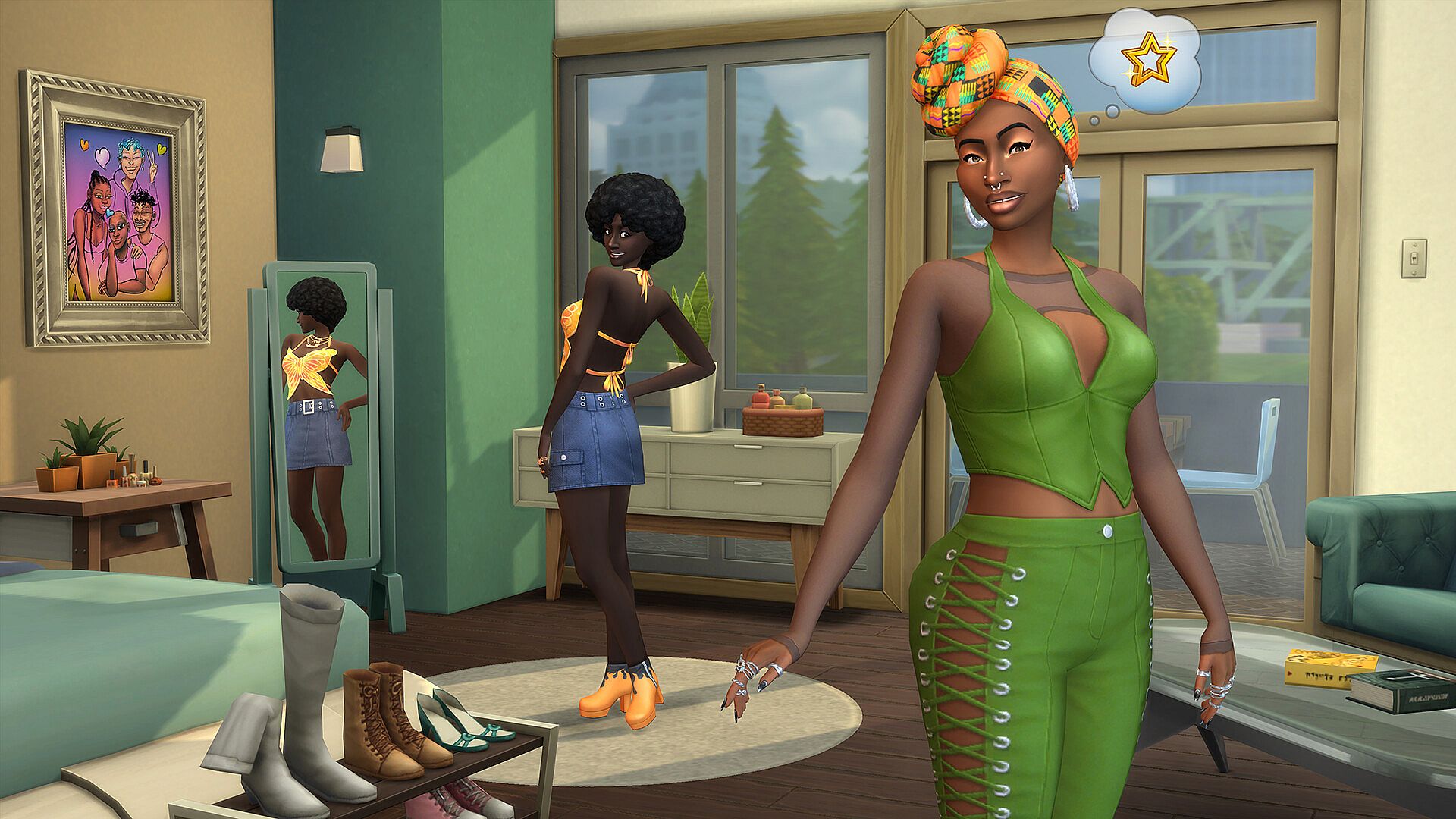 • Forward-facing Throwbacks — Embrace a medley of stand-out colors and lively patterns. Iconic graffiti shirts, a bright bodysuit, and glamorous nails are just some of the options your Sim has for self expression.
