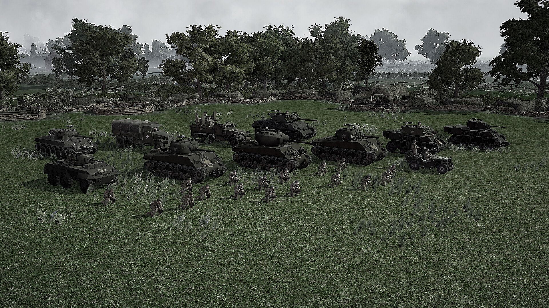 M4A1, M4A3, M4A3 (76), M4 Rhino, M4A3 (105), M5 Stuart, M5 Rhino, M10 Rhino, M8 Scott, M8 Greyhound, Jeeps with 30 cal and 50 cal MGs, M16 "Meatchopper", M18 Hellcat, M3 halftrack (30 cal and 50 cal), 3 Inch AT gun, Regular and replacement infantry, Airborne, Armored infantry, Rangers, Combat Engineers