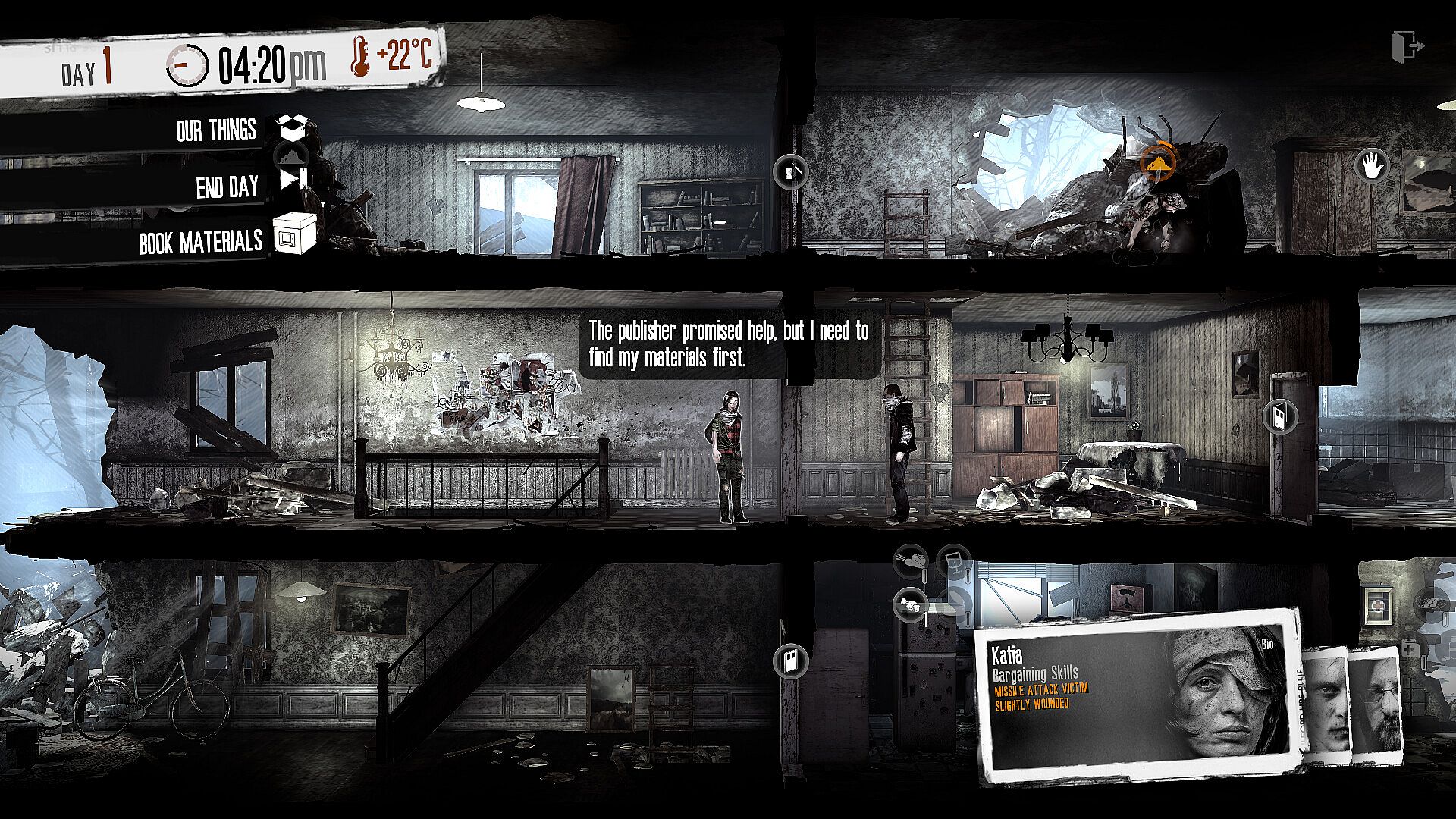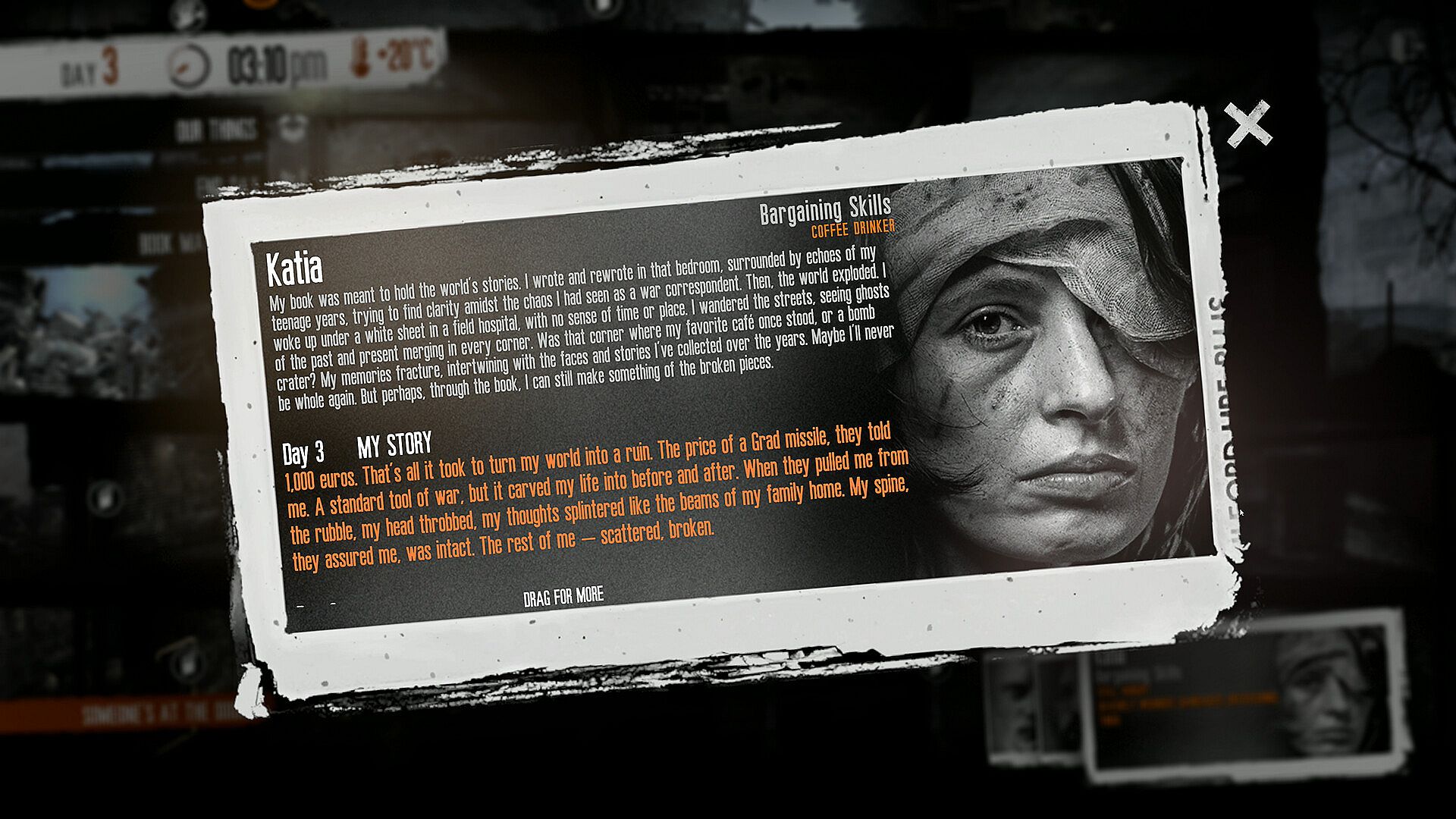 Take the opportunity to revisit the besieged city of Pogoren with Katia, a seasoned war correspondent and one of the citizens you may remember from This War of Mine. The DLC opens with Katia struggling to write a book about the tragedies of people affected by conflicts. A sudden missile attack shatters Katia’s home and draws her work to a stop. Now, severely injured, she waits for a rescue party sent by her publisher. Before it arrives, you must help Katia look for her missing book materials while trying to survive in a war-torn city.