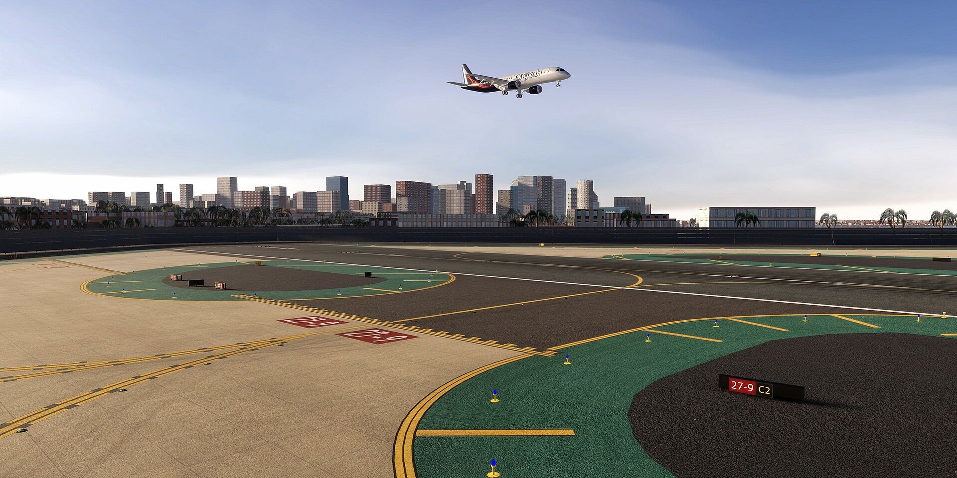 – Taxi signs and 3D taxi lights around the airport that follow the curvature of the line.