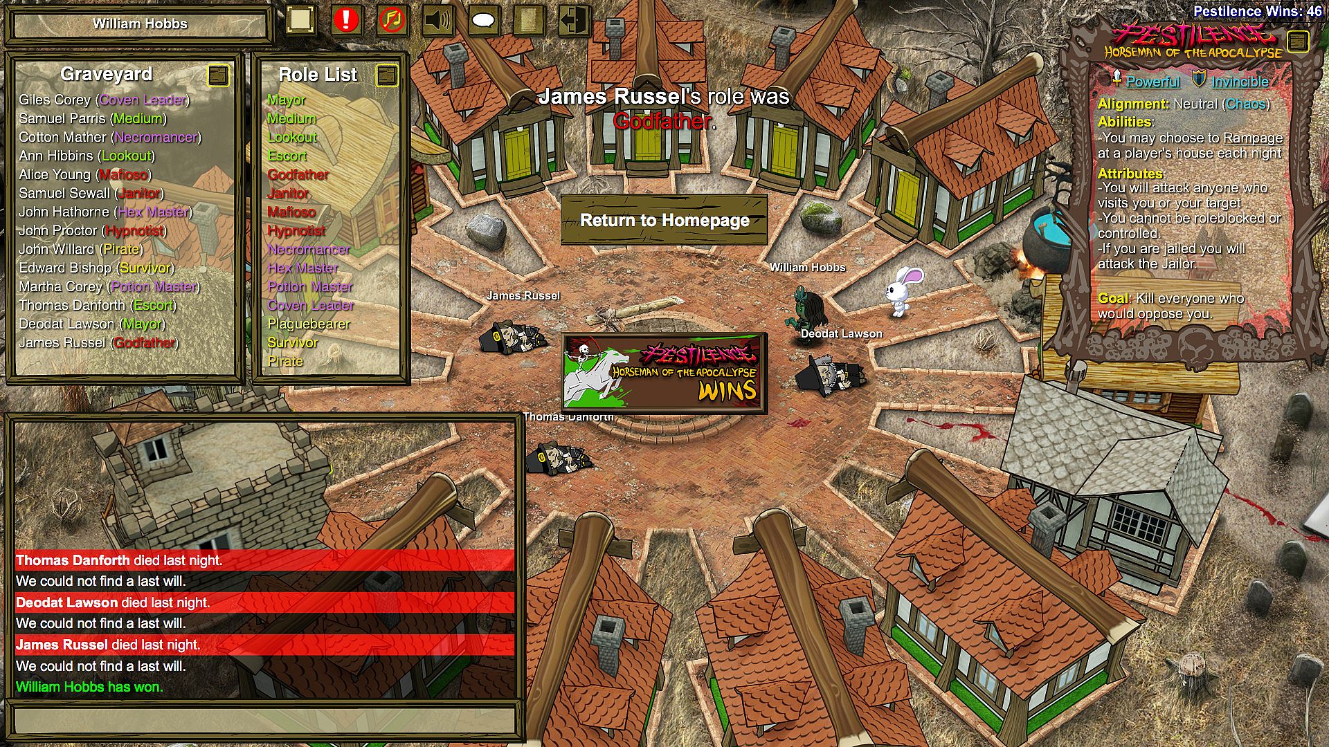 The Coven is a new faction of witches that will enter the never ending death fest that is Town of Salem. The Coven will include 5 new witch roles, and the current Witch has taken the role of the Coven Leader! One of the Coven’s greatest strengths is the Necronomicon. The Necronomicon’s ancient powers will amplify the abilities of any witch that possesses it! The Coven will summon the Necronomicon early on in the game. When the holder of the Necronomicon dies a random Coven member will get the Necronomicon.