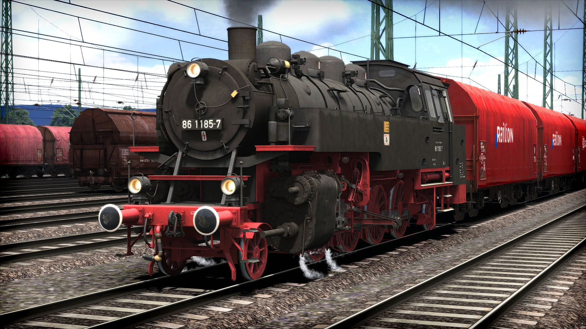 The DR BR 86 for Train Simulator recreates the Class 86 steam locomotive as it operated for DB and DR as a mixed traffic locomotive in the common black and red livery from the 1930s used by Deutsche Bundesbahn. As a steam locomotive that operated into the 1970s and 1980s, it is fitted with modern safety systems such as PZB and also comes with Ucs wagons in black and white with the DB logo and Shimms wagons in DB Schenker and Railion livery.
