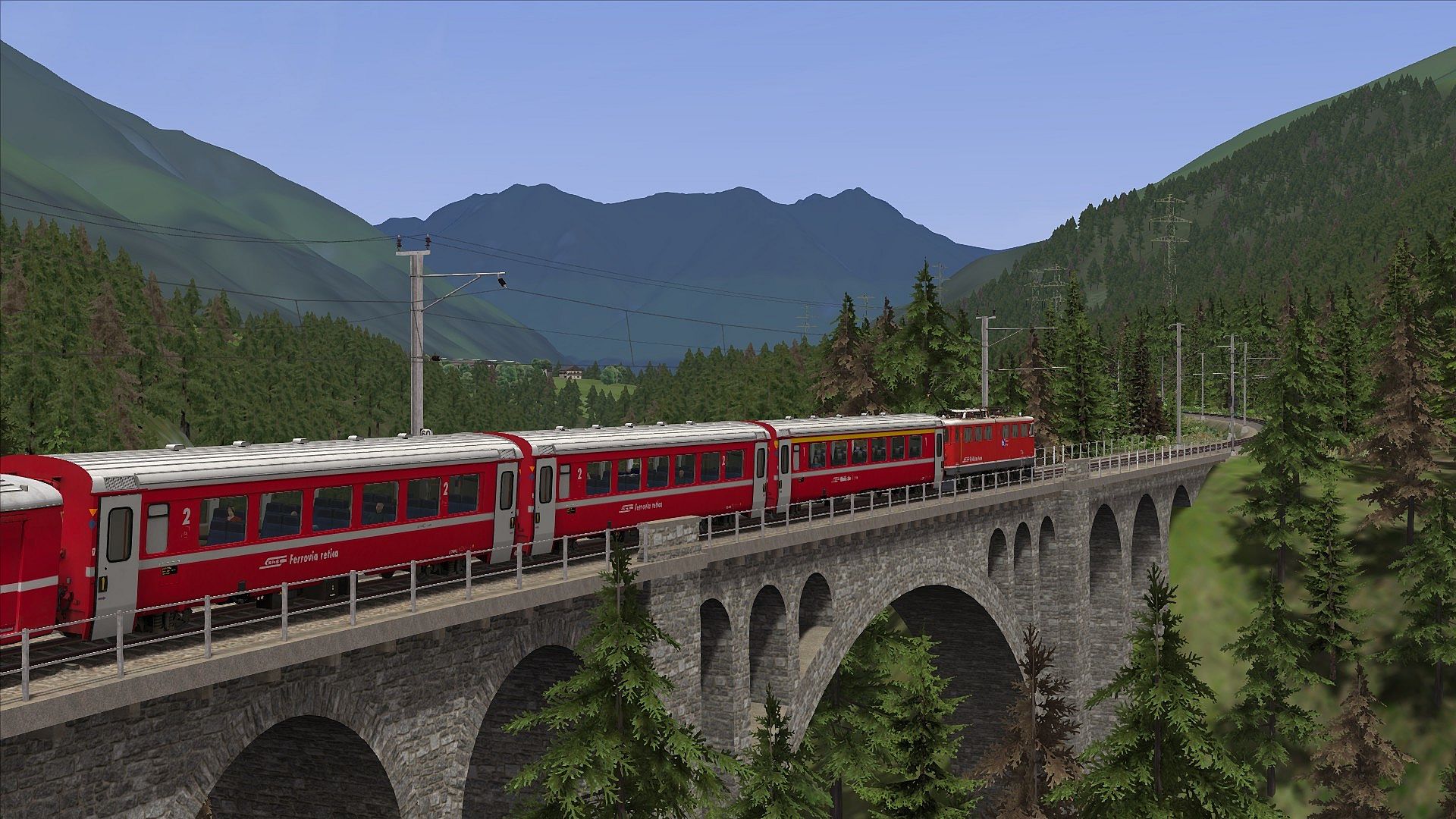 Included in the route is the iconic RhB GE 6/6 II locomotive in its typical red livery, with which you’ll be challenged in a range of scenarios. Also included are two EW4 passenger coaches, baggage coach, and 2 freight cars with different loadings.