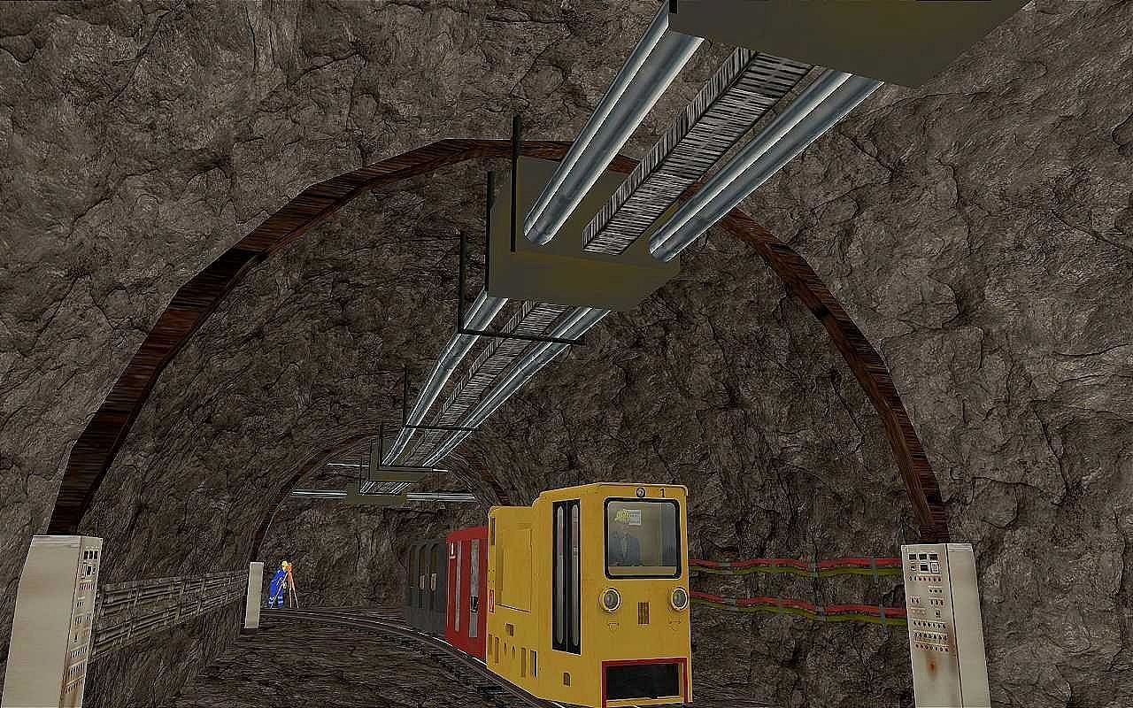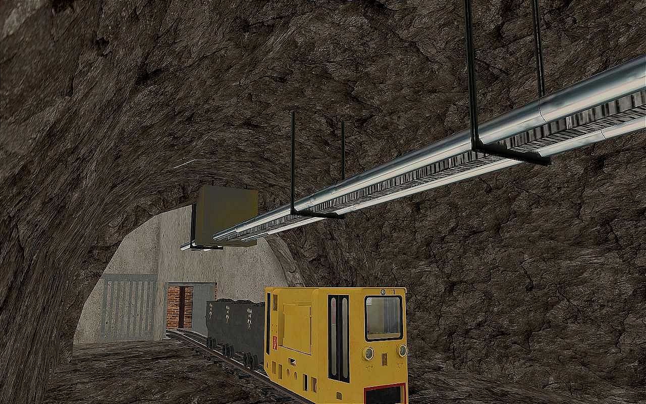 A small module showcasing a set of content designed for representing underground mining scenes and particularly the underground transport of coal and other ores plus mining equipment and personnel. It includes mining locomotives and rolling stock plus a range of infrastructure such as tunnel splines, tracks, switch indicators and signage plus portals and mine worker figures. Above ground equipment includes a classic elevator and some road transport vehicles.