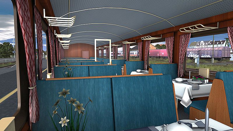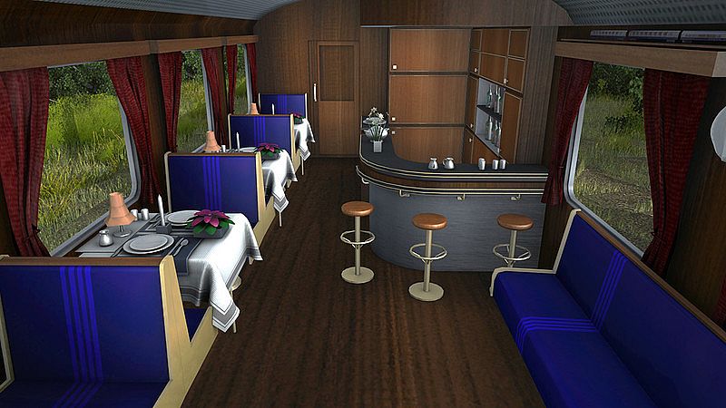 Our greatest demand was to realise this exceptional luxury train appropriately in Trainz Simulator and, therefore, just as in the Orient Express, we once again went out of our way: the countless materials and details used, let the train appear extremely realistic. Apart from the four blue Rheingold-Cars provided, two passenger interiors welcome you aboard. Unprecedented effort has been put into the interior of the dome car as well as the dining car. We, therefore, invite you to explore these exceptional cars. Whether you are heading for the bar, the restaurant or for the dome, all these areas have been realised with great attention to detail. Take a look at the table decoration - even in the coffee pots, the plate inscriptions or the flowers. And perhaps you will even find the miniature Rheingold on your exploration tour?